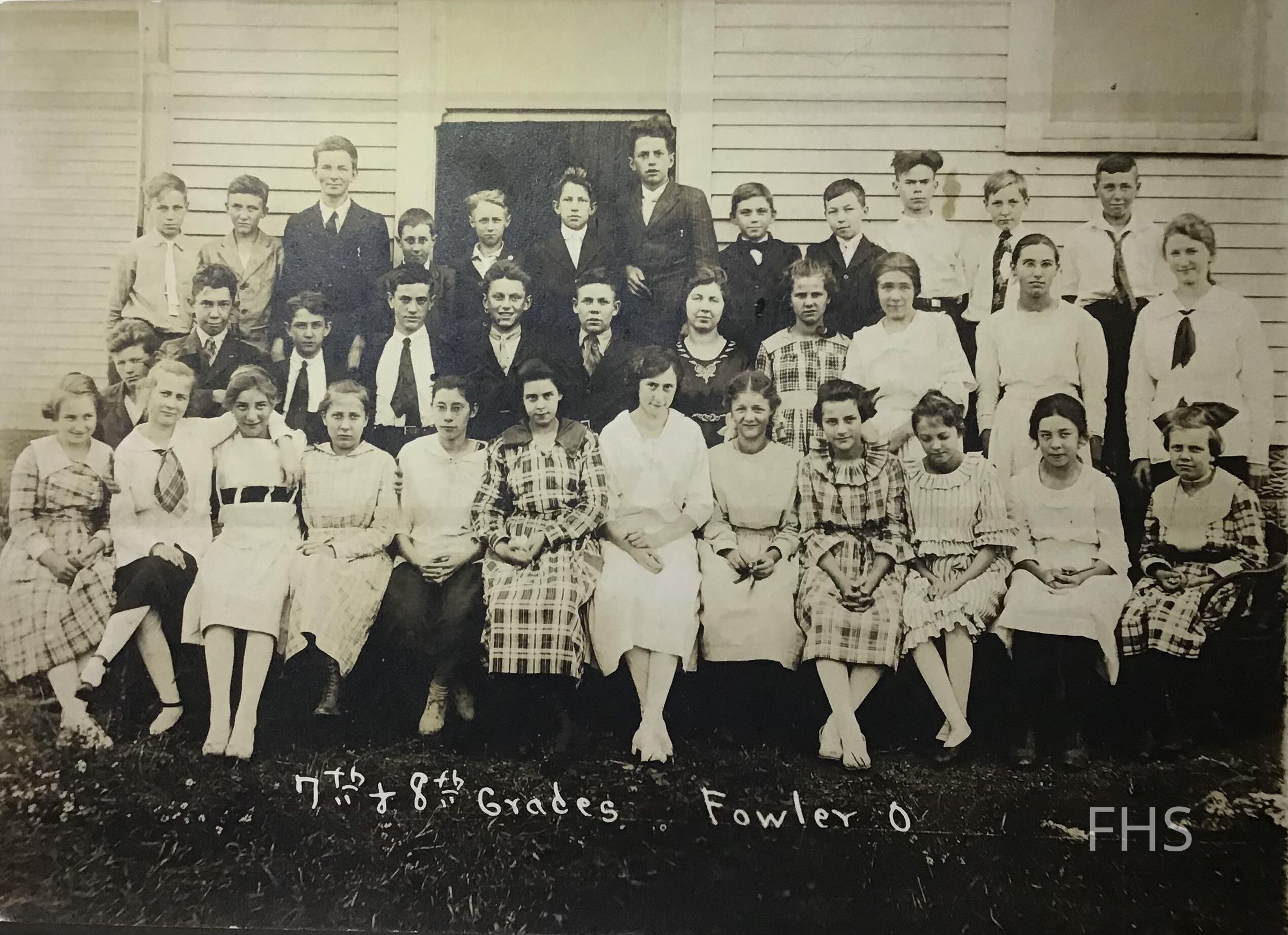 A class photograph from 7th and 8th grade at Fowler School. Students and teacher are unidentified.Cataloged By