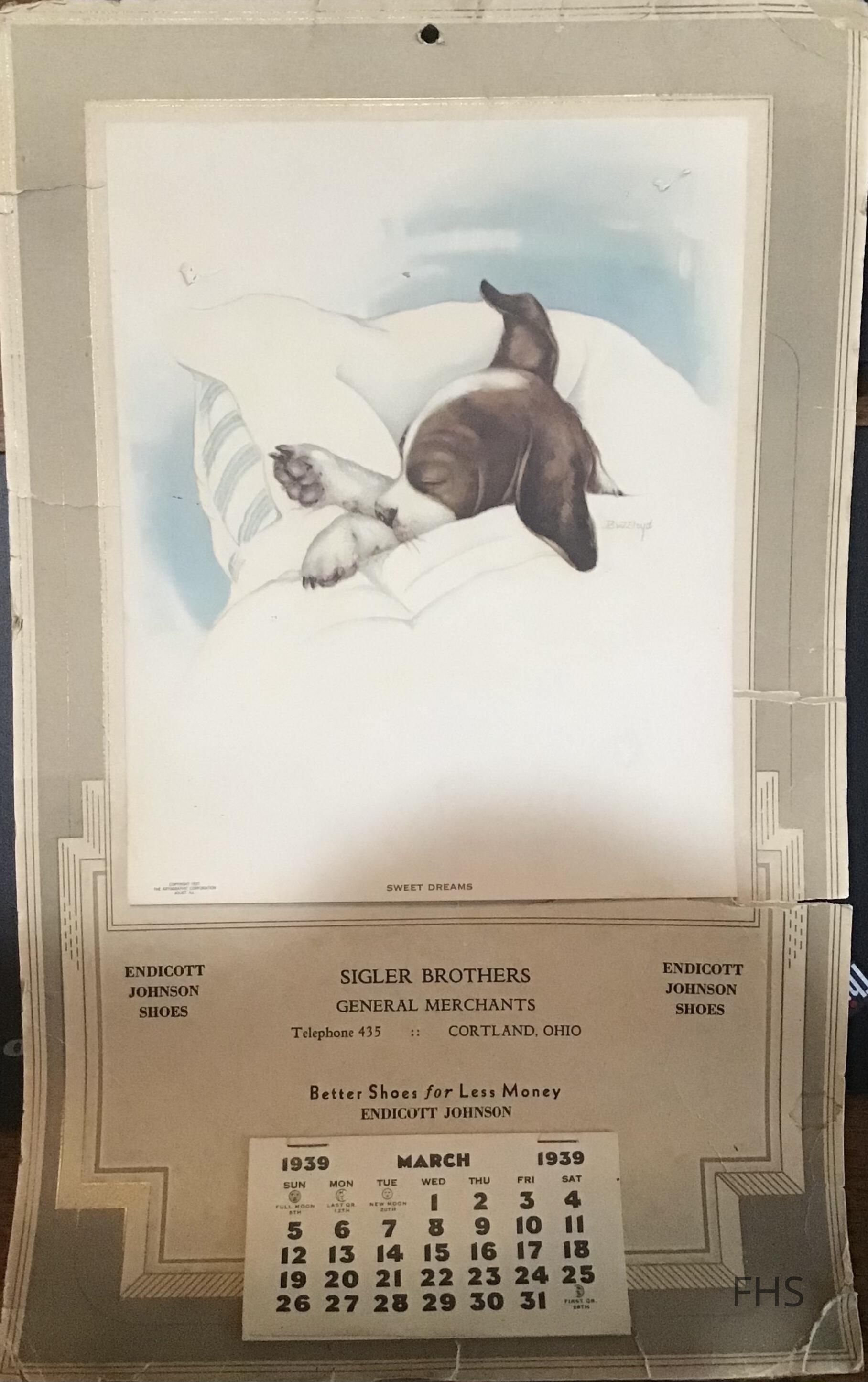 An advertisement calendar from Sigler Brothers General Merchants in Cortland, Ohio from 1939.Cataloged By
