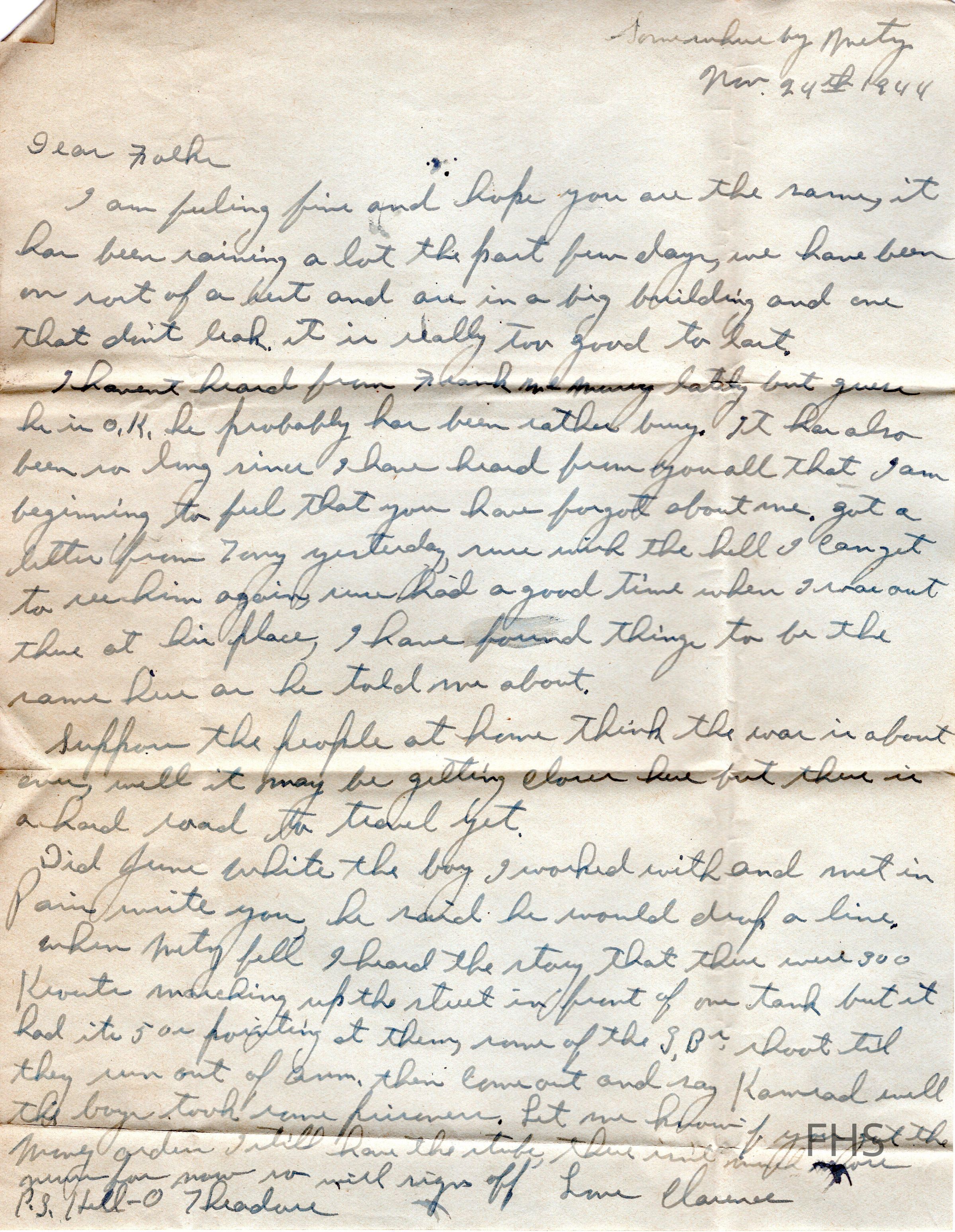 A letter written by Clarence Dahman to his family during WWII in 1944.Collection