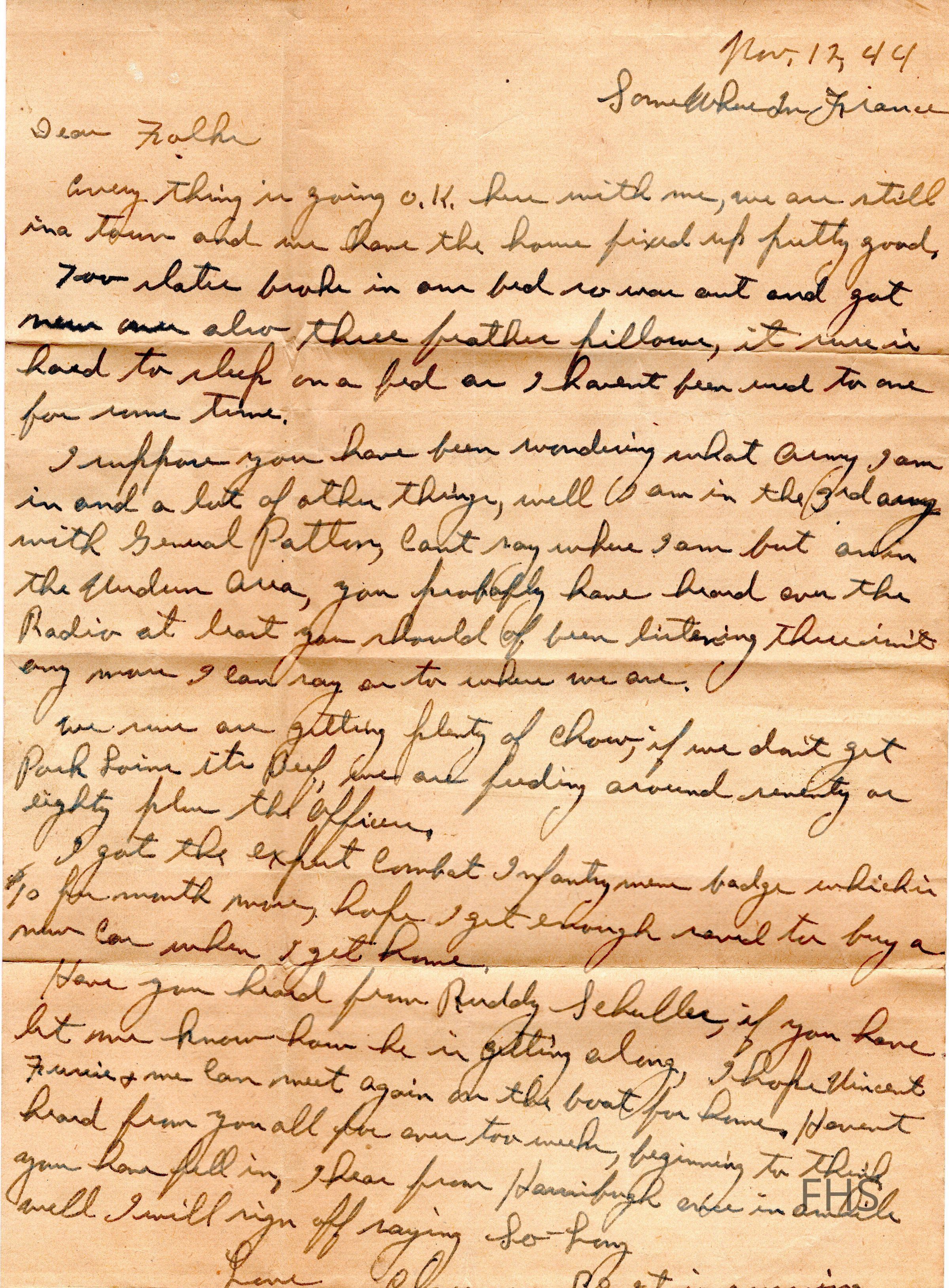 A letter sent by Clarence Dahman to his family during WWII in 1944.Collection
