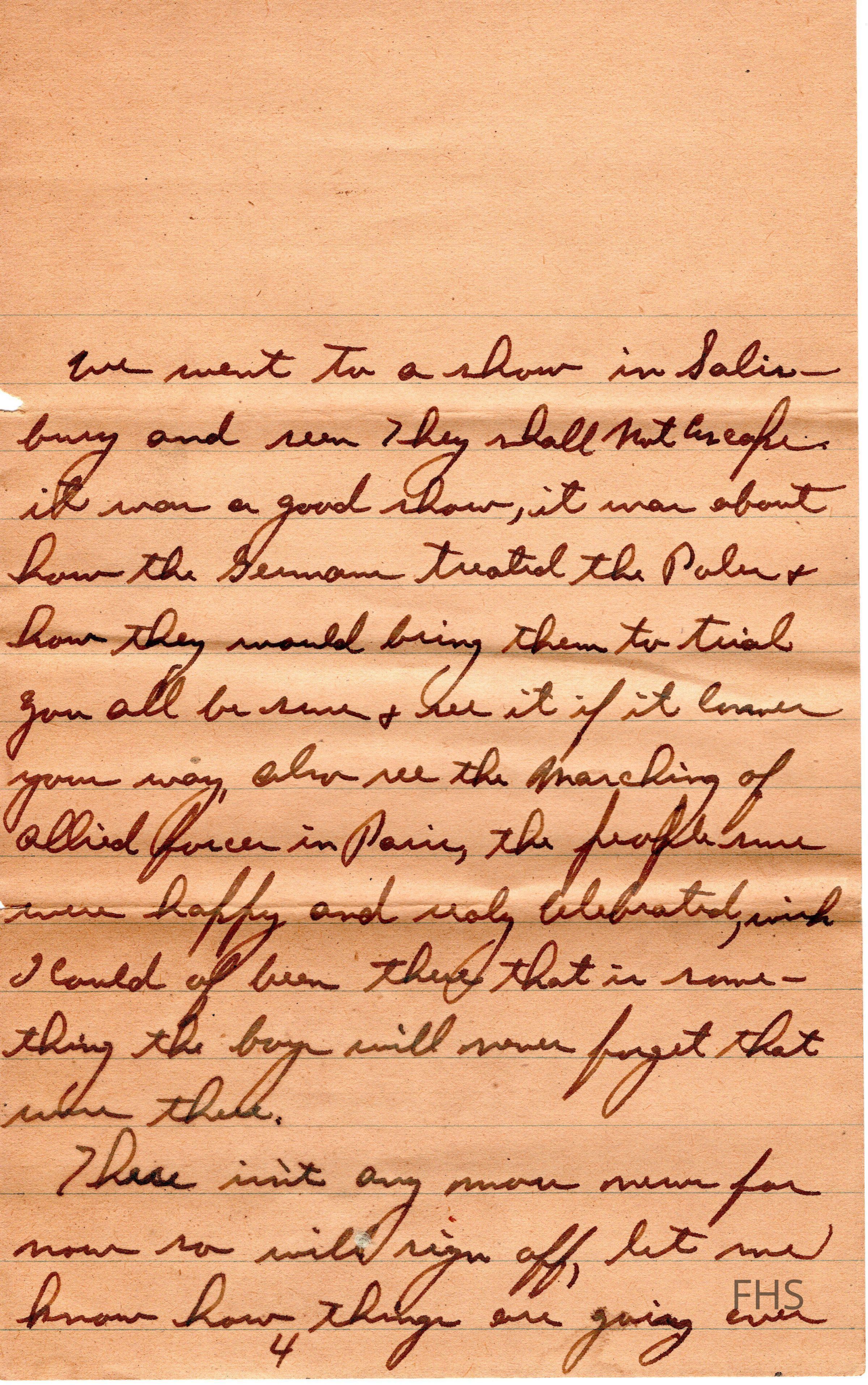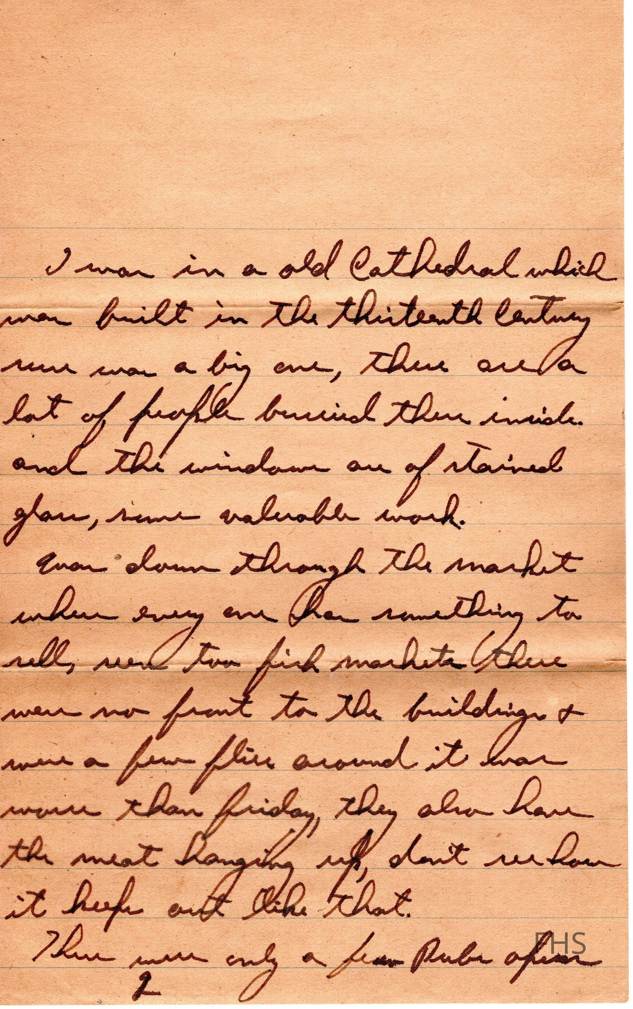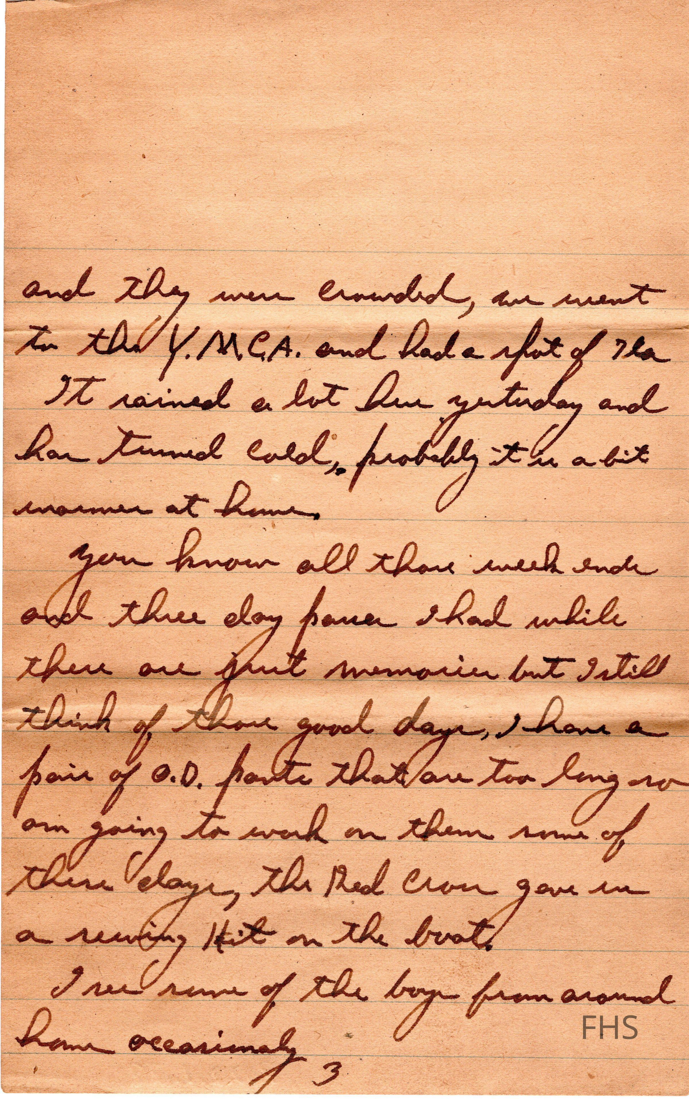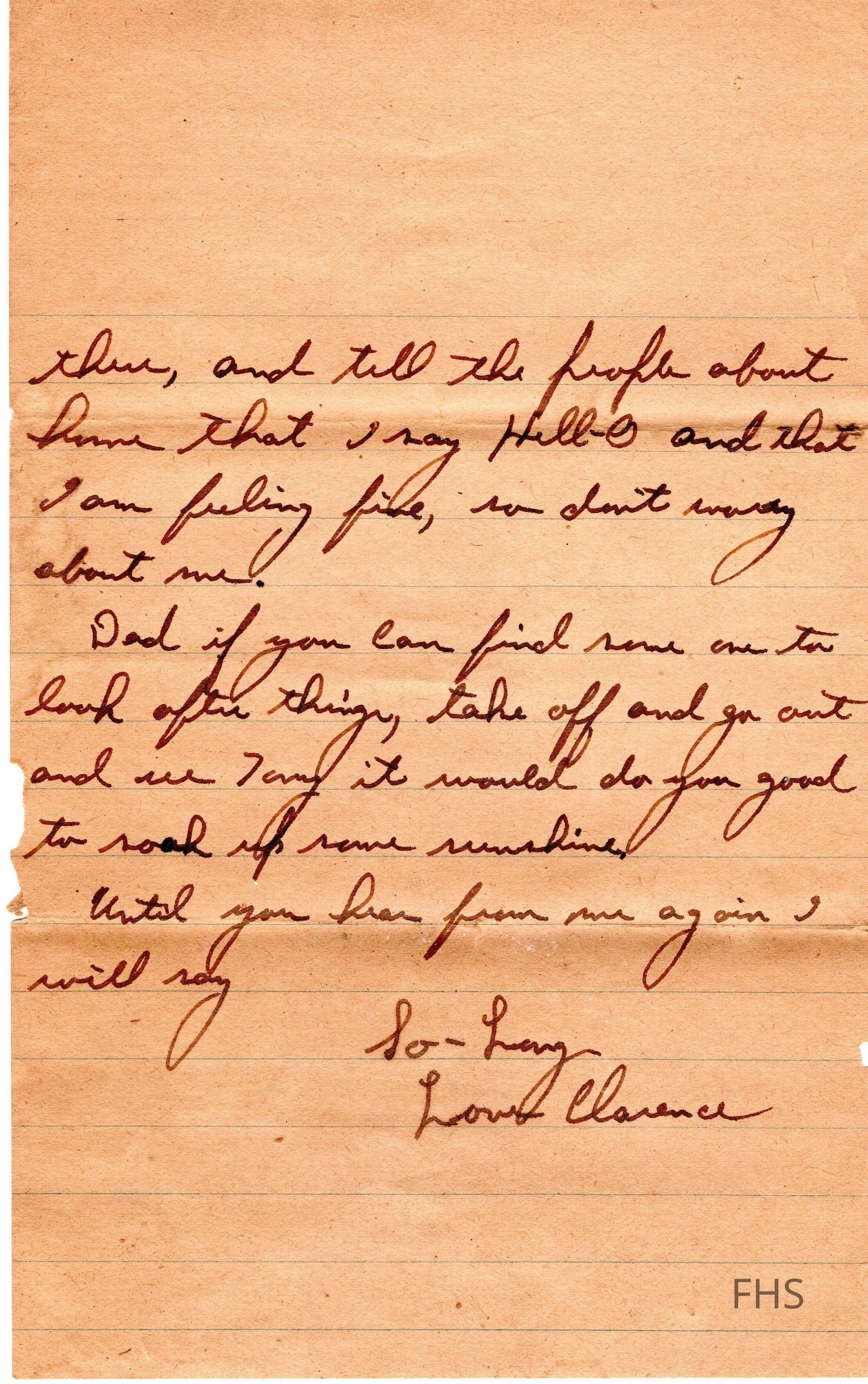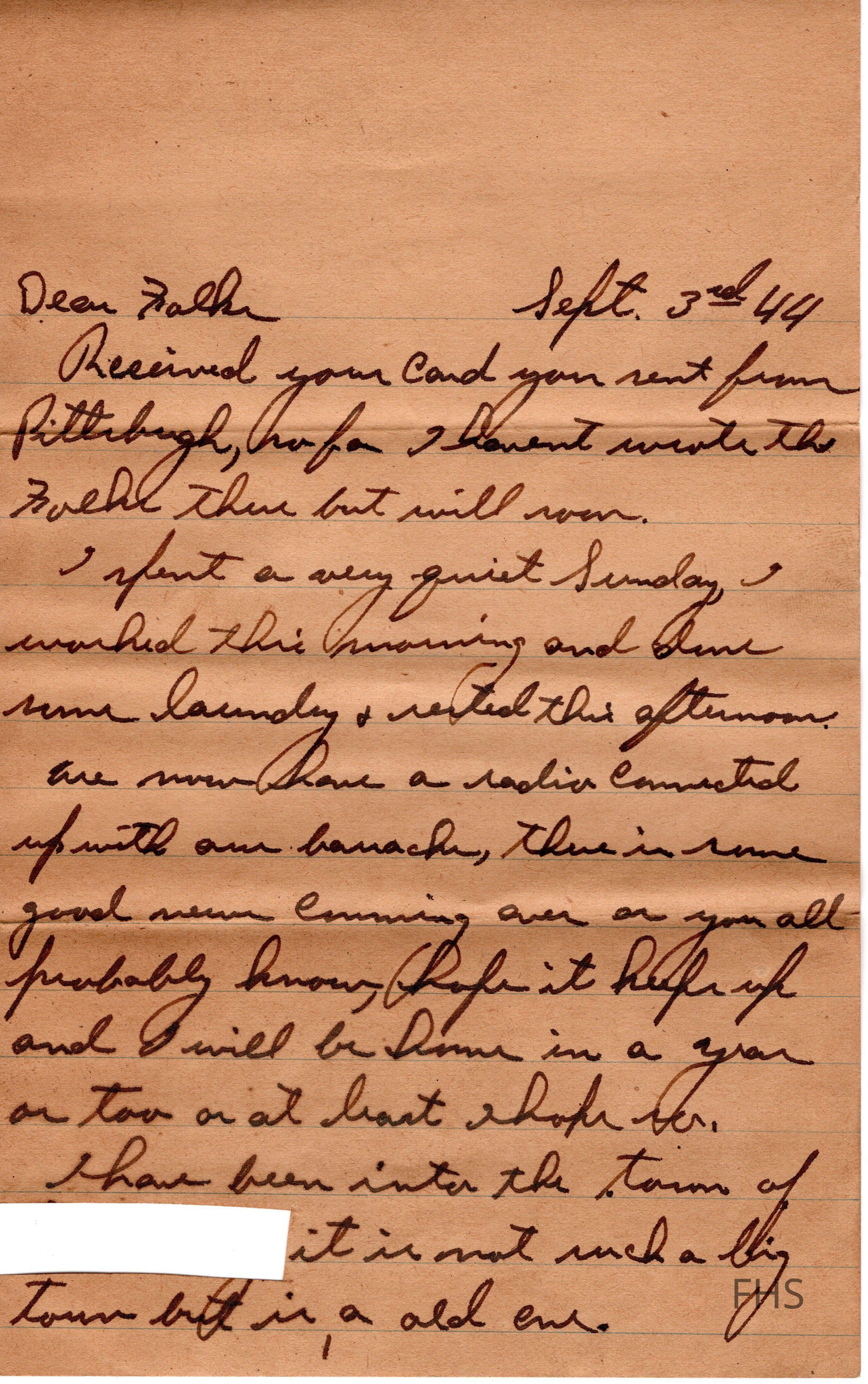A letter written by Clarence Dahman to his family during WWII in 1944. Notice on page 1, there is a cut out where the name of a town was written. This was censored for military reasons.Collection