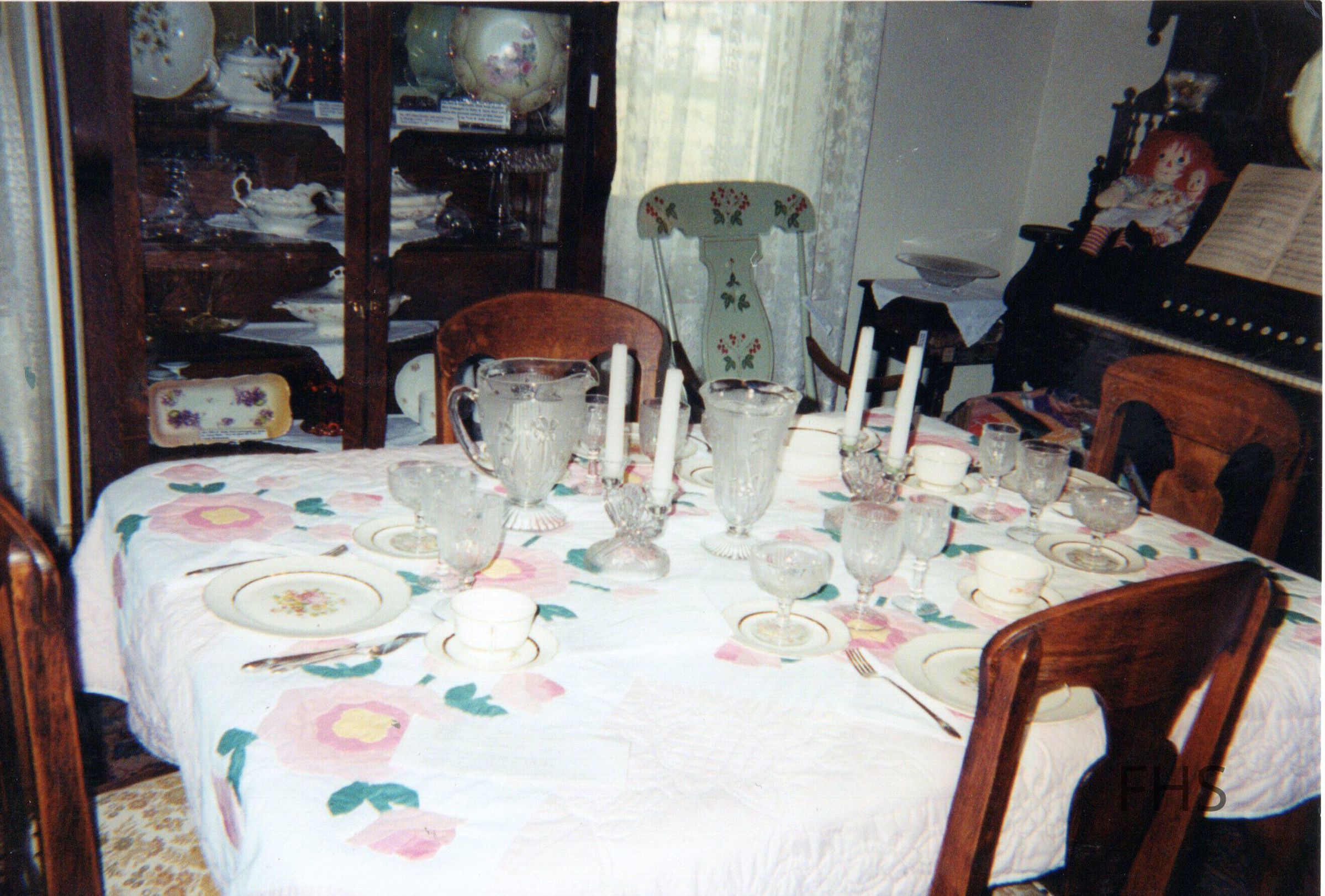 A photograph of a temporary display of a formal dinner setting in the dining room at the Butts Museum by the Fowler Historical Society.Cataloged By