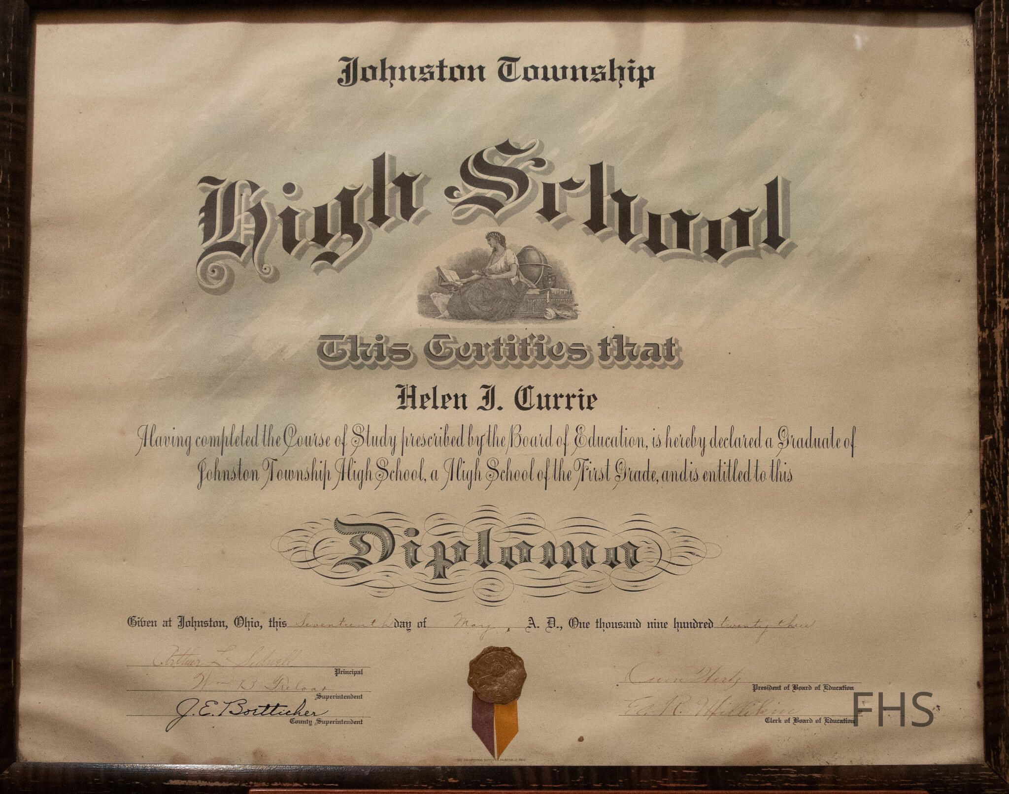 Helen Currie’s high school diploma from Johnson, Ohio in 1923.Cataloged By