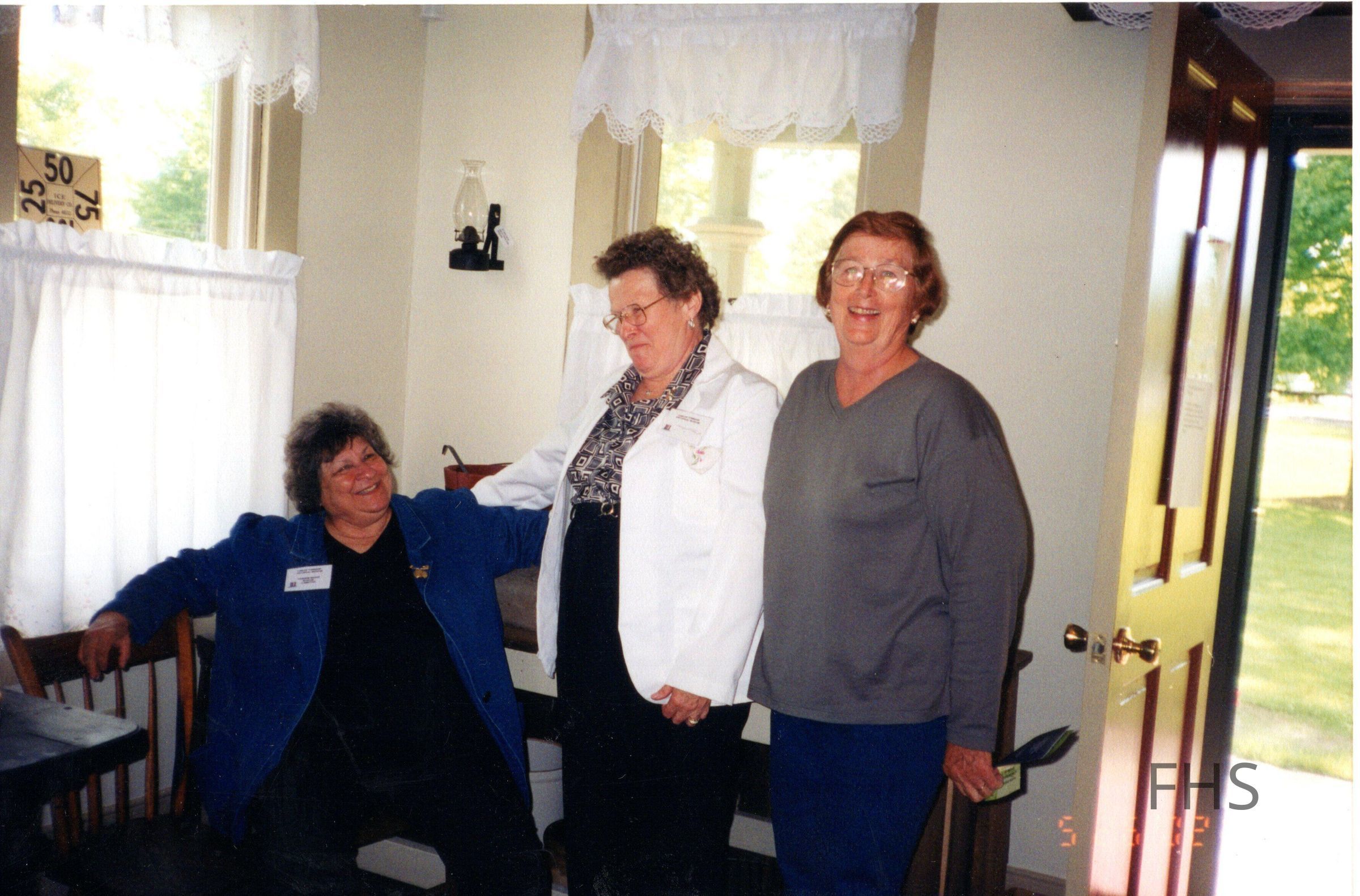 A photograph taken at the Fowler Historical Society Open House in 2002. Pictured left-right: Roseanne Mahon, Margaret Addicott, Mary Martin.Cataloged By