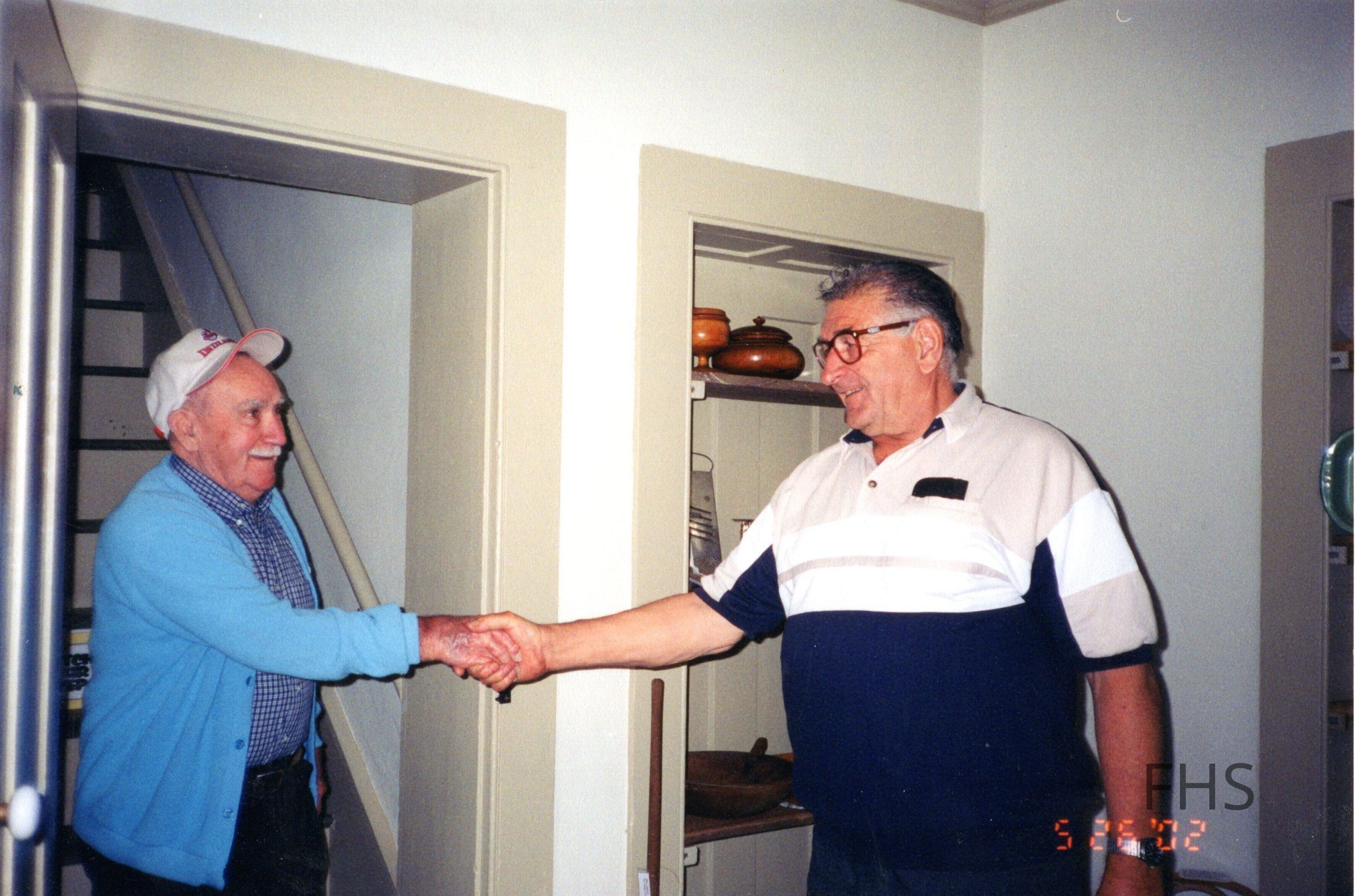 A photograph taken at the Fowler Historical Society Open House in 2002. Pictured in the photo are Bob McDonald and Ben Martin.Cataloged By