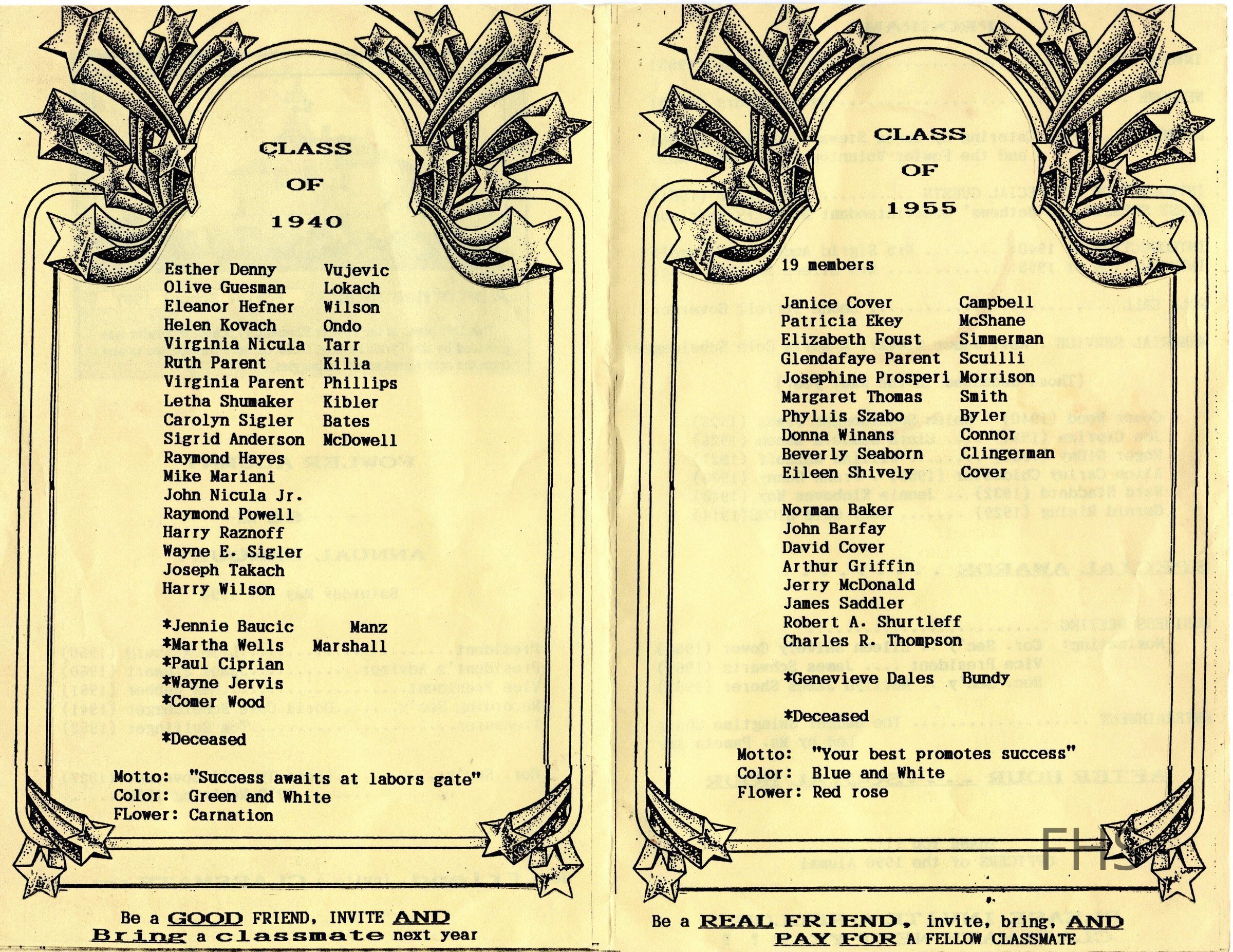 The program for the 1990 Annual Alumni Banquet from May 19, 1990 honoring the classes of 1940 and 1955.