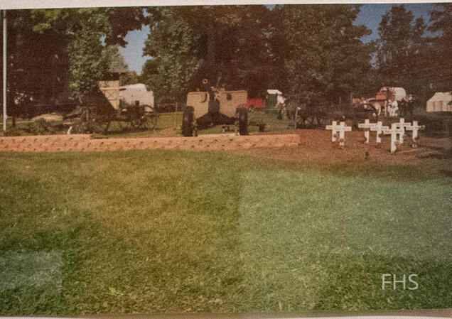 A photograph of Fowler Center Memorial to honor all that gave their lives in battle. The photo shows the cannons and crosses as they were in 1999 before other crosses were added.Cataloged By