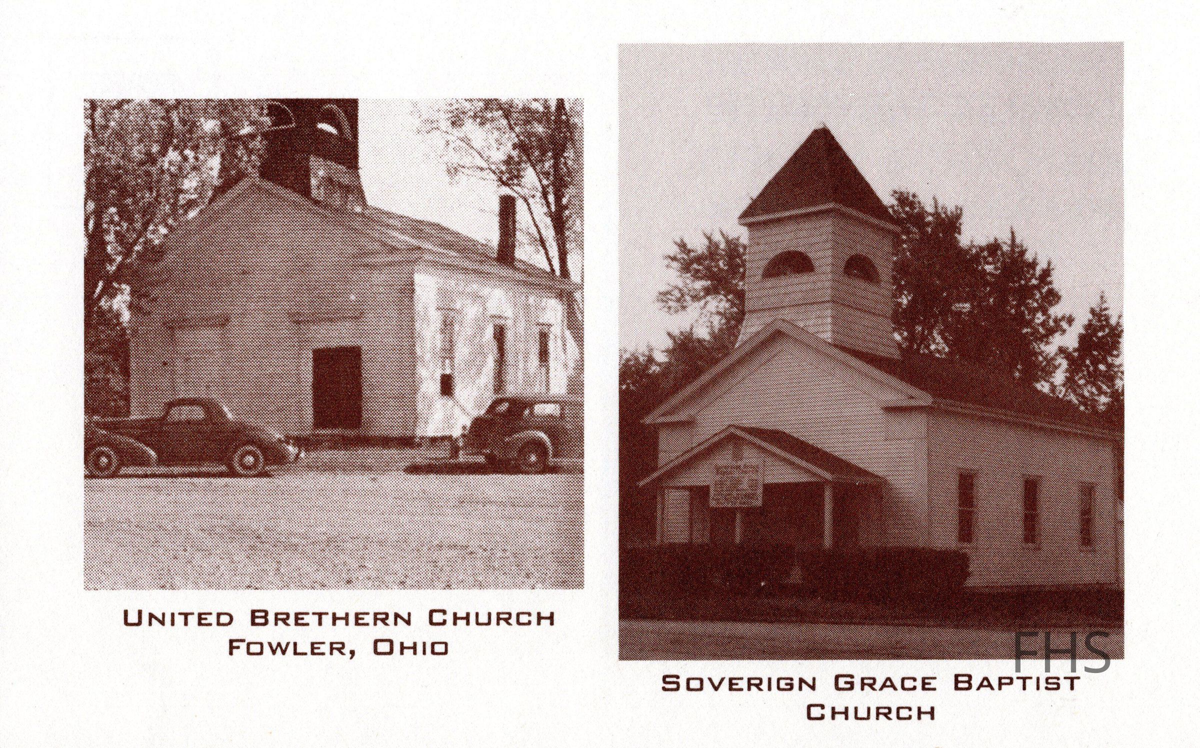 A postcard of the United Brethern Church and the Sovereign Grace Baptist Church.Cataloged By