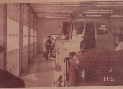 A photograph of the inside of the fire station showing a 1965 Dodge Power Wagon used as grass fire unit truck and a 1972 Ford with a 1000 GMP pump.