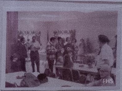 A photograph of the inside of the fire station. People are not identified.Cataloged By