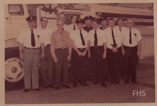 A photograph of the Fowler firefighters and the factory representative from Young Fire Equipment in front of new truck in the new station in 1972.