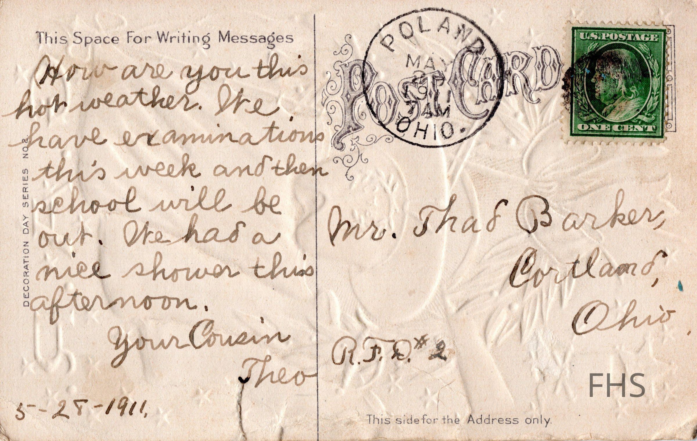 A Grand Army of the Republic postcard sent to Thad Barker from his cousin Theo in 1911.Cataloged By