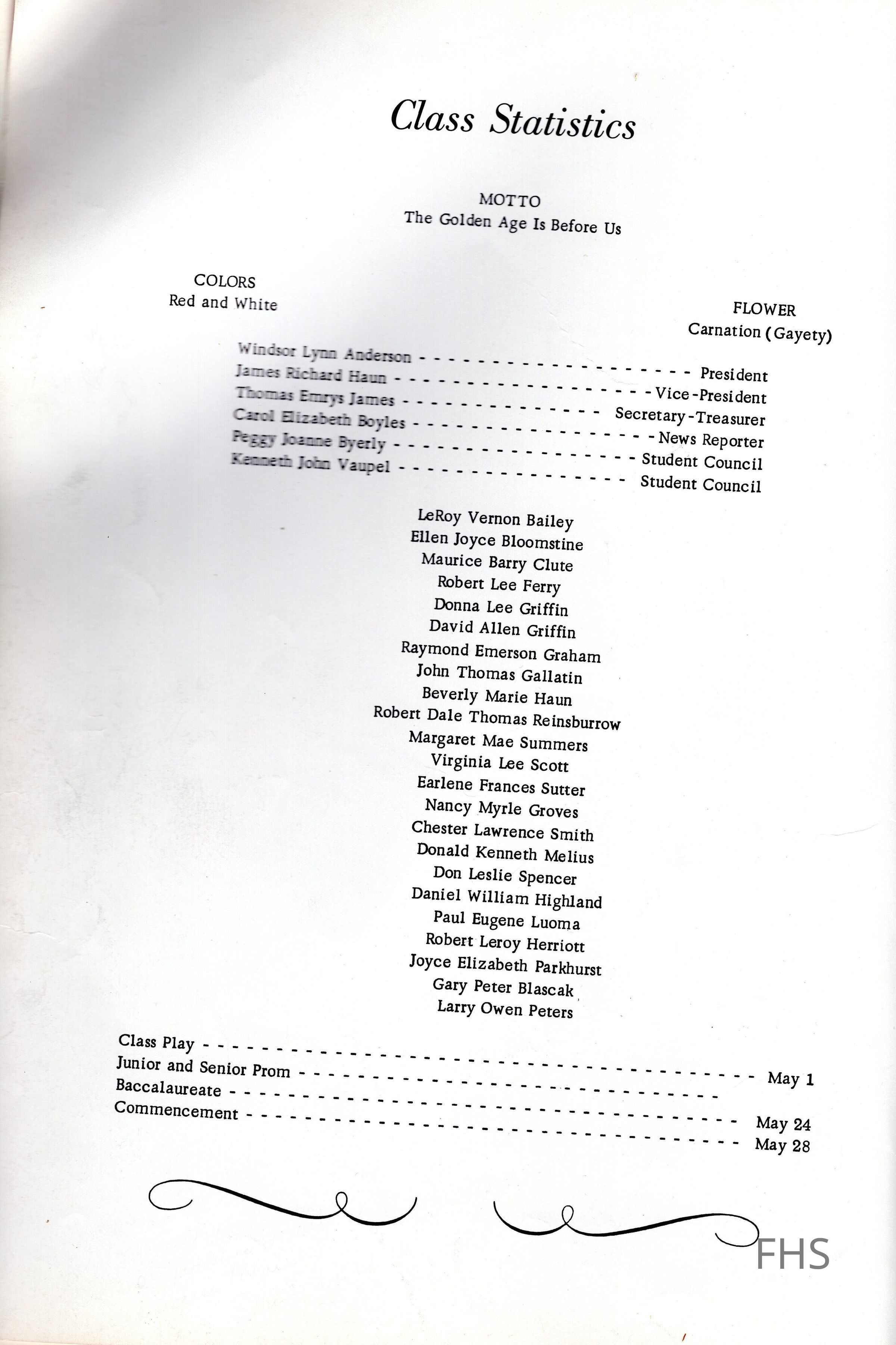 Fowler High School yearbook from1959. Included are graduate names, names of students in grades 1-12, class statistics, photos of students and staff, photos of sports teams and of activities from the year. It belonged to Claudia Swindler and it has signatures of some students and staff.