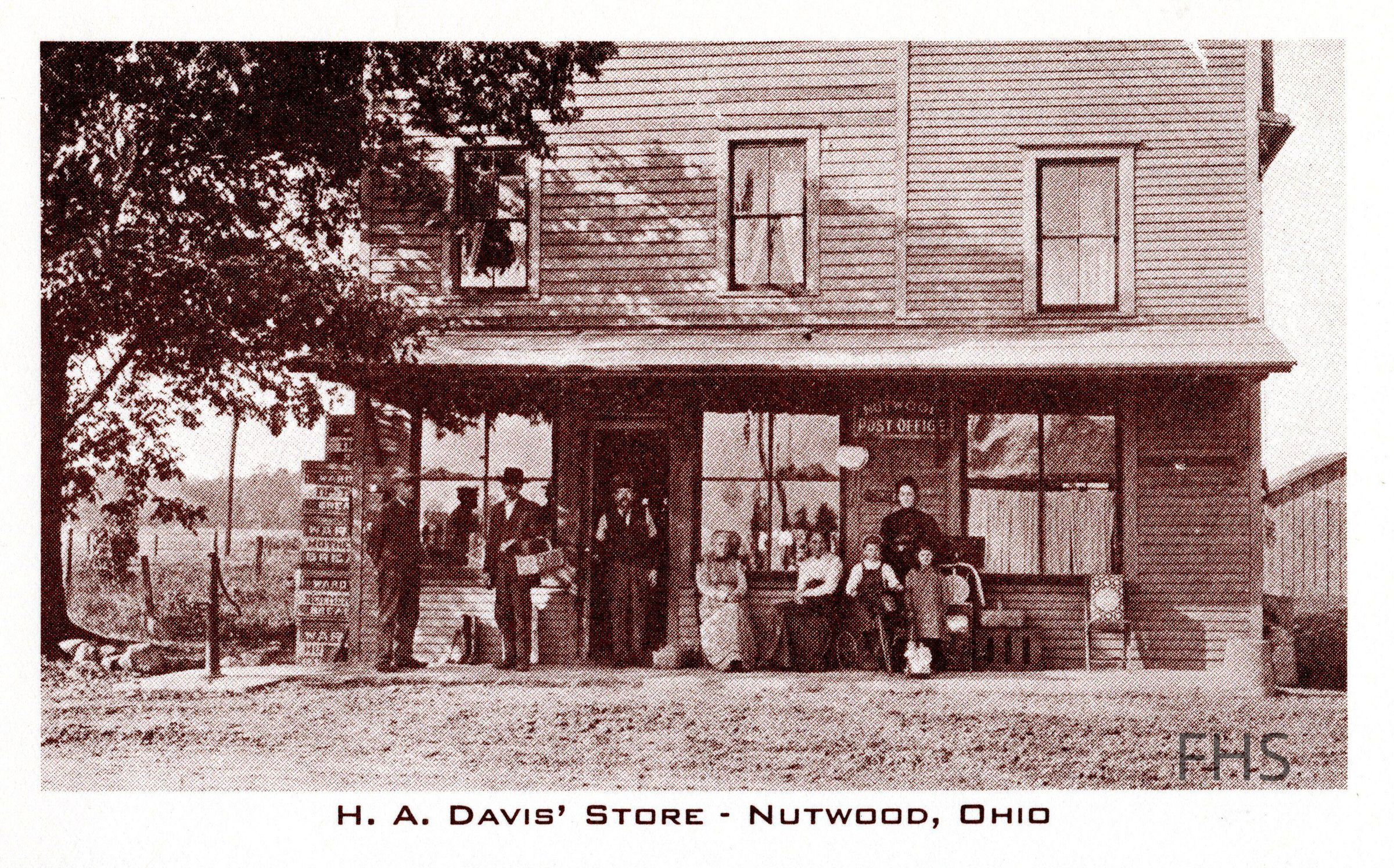 A postcard of the H. A. Davis Store in Nutwood, Ohio with unidentified people.Cataloged By