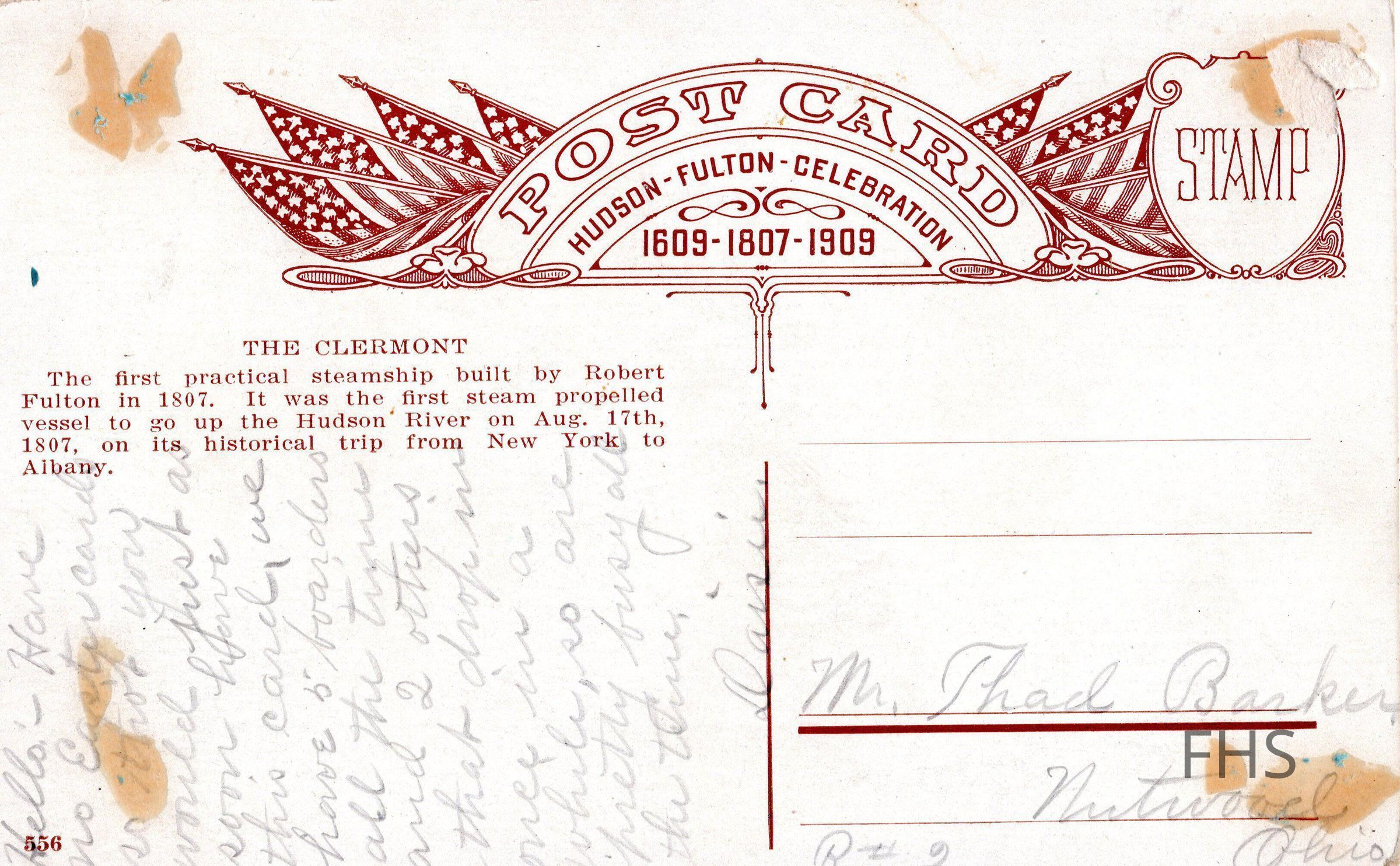 A postcard featuring Hudson-Fulton-Celebration to Thad Barker by Daisie circa 1910.Cataloged By