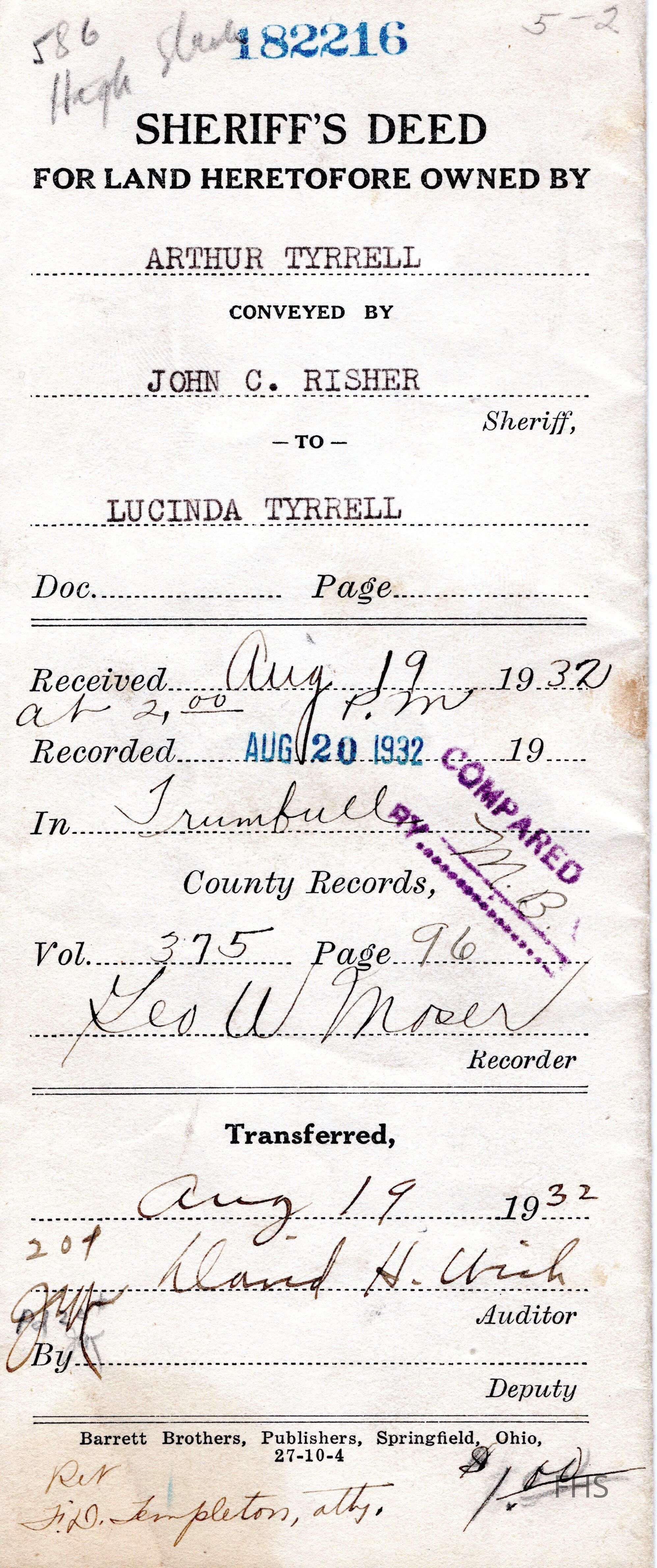 Lucinda Tyrrell Sheriff's Deed, 1932Entry/Object ID
