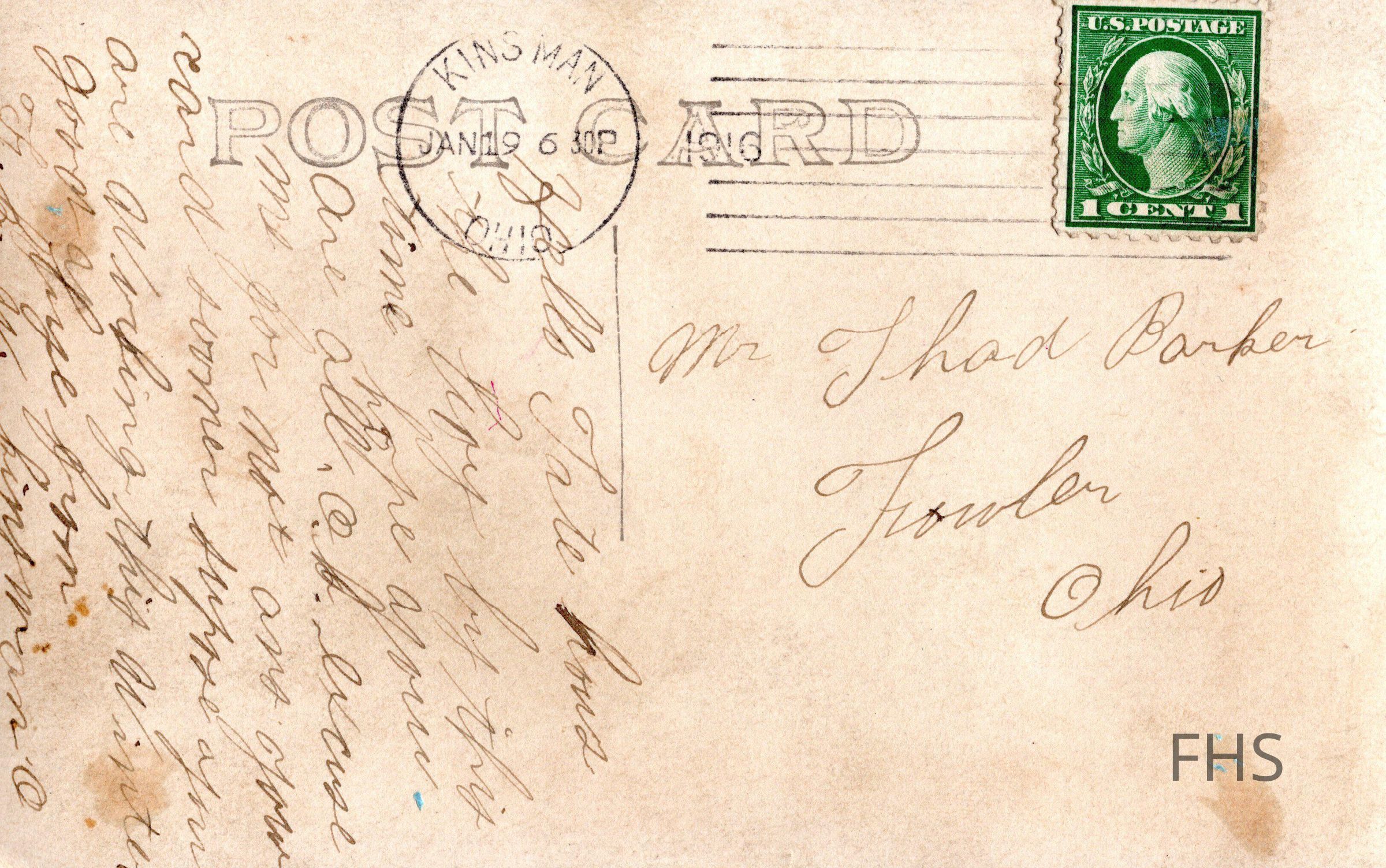 A McGranahan’s Residence in Kinsman, Ohio postcard sent to Thad Barker by T. B. W. circa 1900.Cataloged By