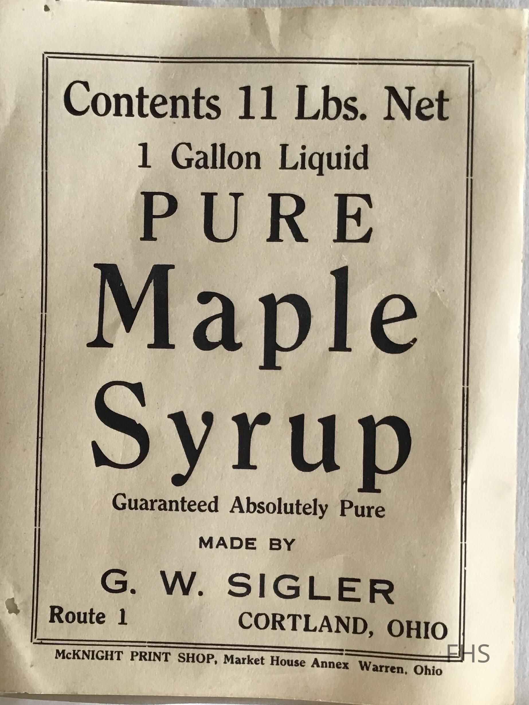A product label for maple syrup from G. W. Sigler on Route 1 Cortland, Ohio.Cataloged By