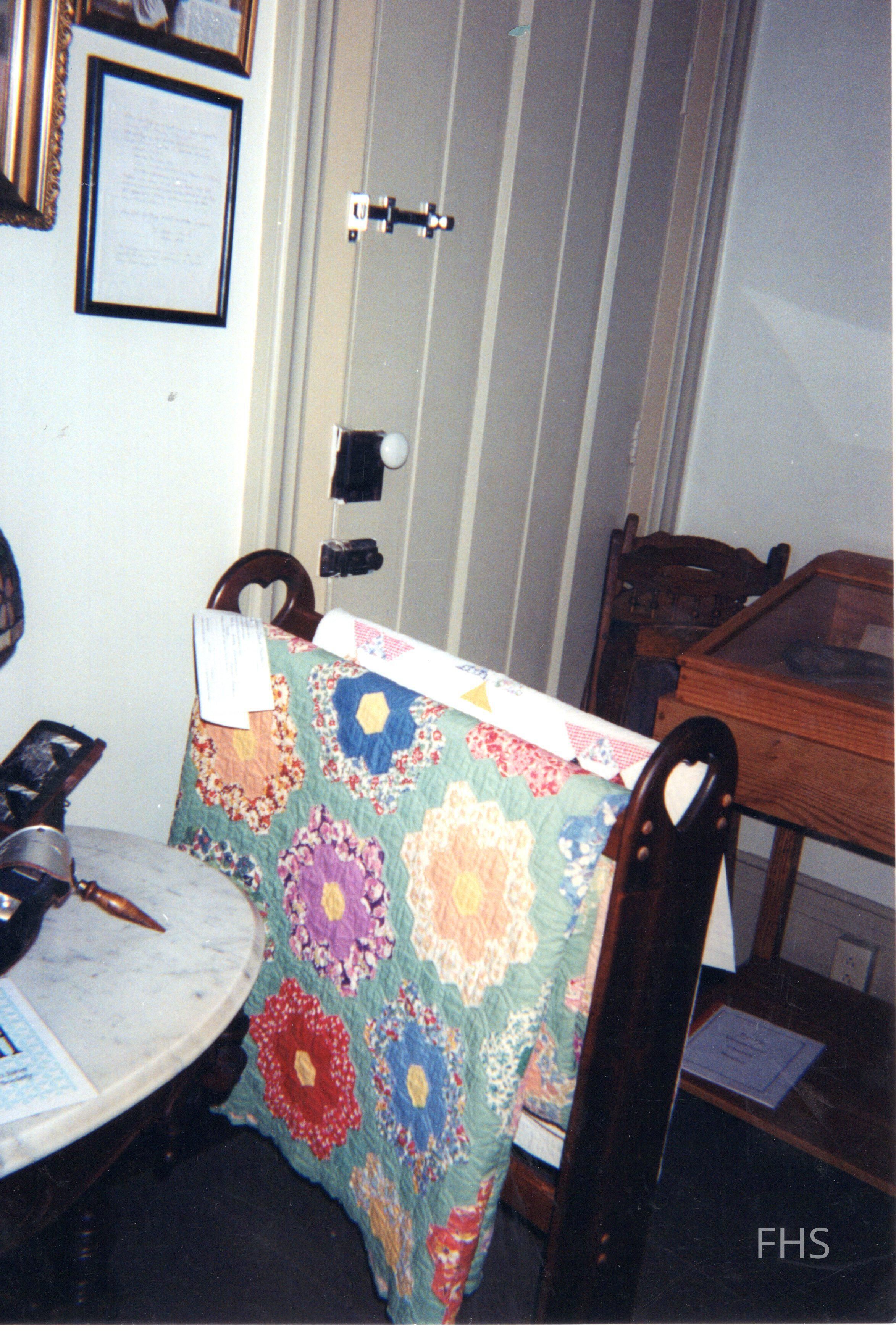 A photograph of a temporary display of quilts at the Butts Museum by the Fowler Historical Society.Cataloged By