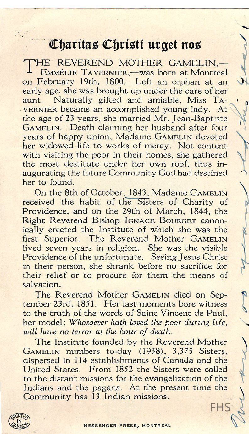 This card about the Reverend Mother Gamelin and the Institute founded by her was sent to Adam J Dahman by his sister, Sister Mary Benedicta, with the Institute in 1943.Collection