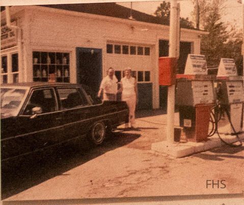 A photograph of the Sohio Service Station on Route 193 in Fowler, Ohio taken circa 1980. Standing behind the car are Robert and Doris McDonald.