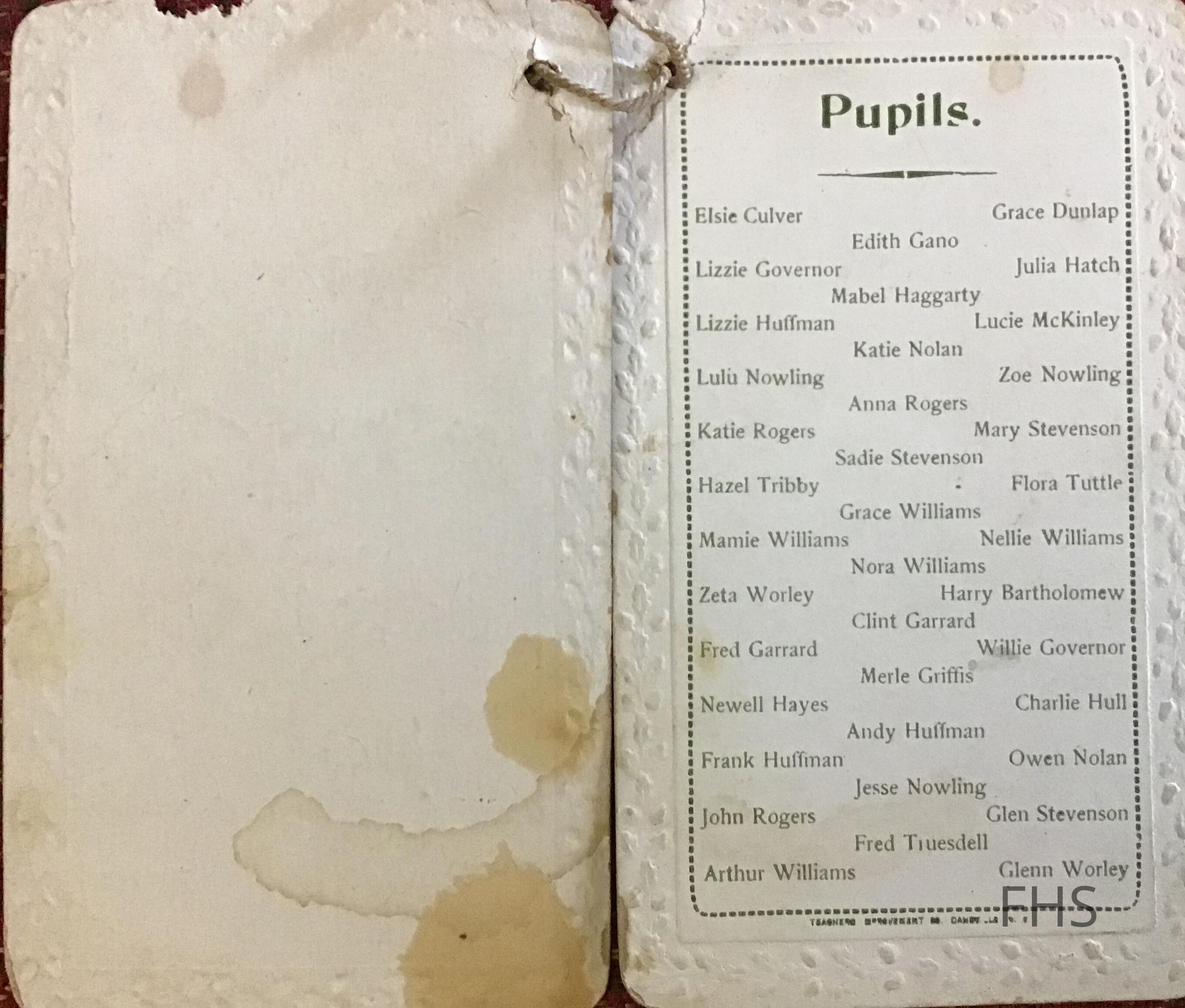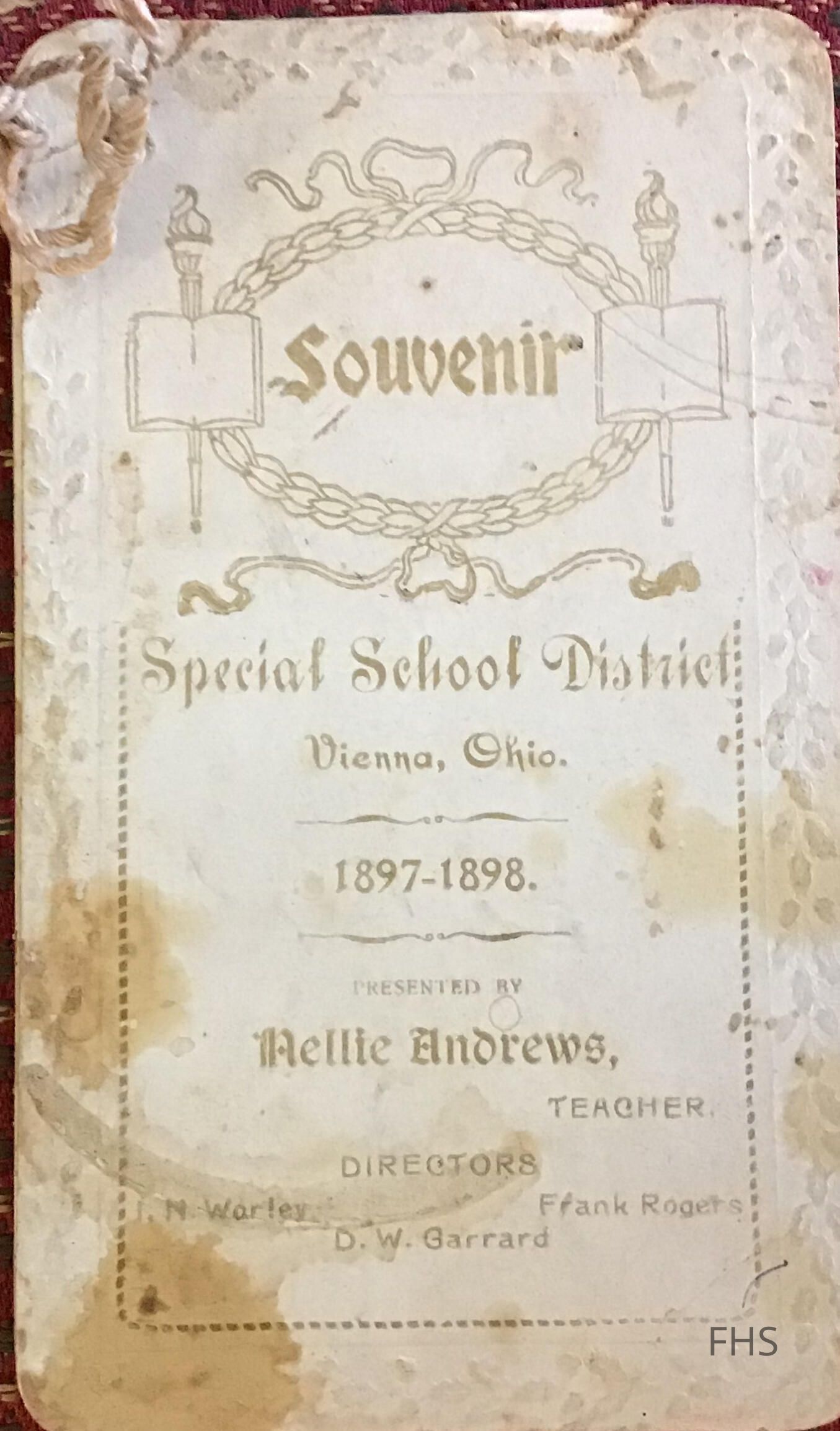 A souvenir card from Vienna, Ohio dated 1897-1898 school year. Lists the teacher as Nellie Andrews and directors as J.M.Worley, D.W. Garrard and Frank Rogers. Pupils from the class are also listed.Collection