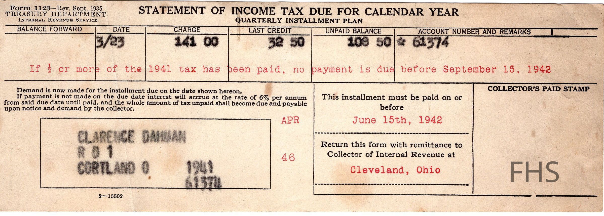 A statement of income taxes due for Clarence Dahman from 1941, due in 1942.Collection