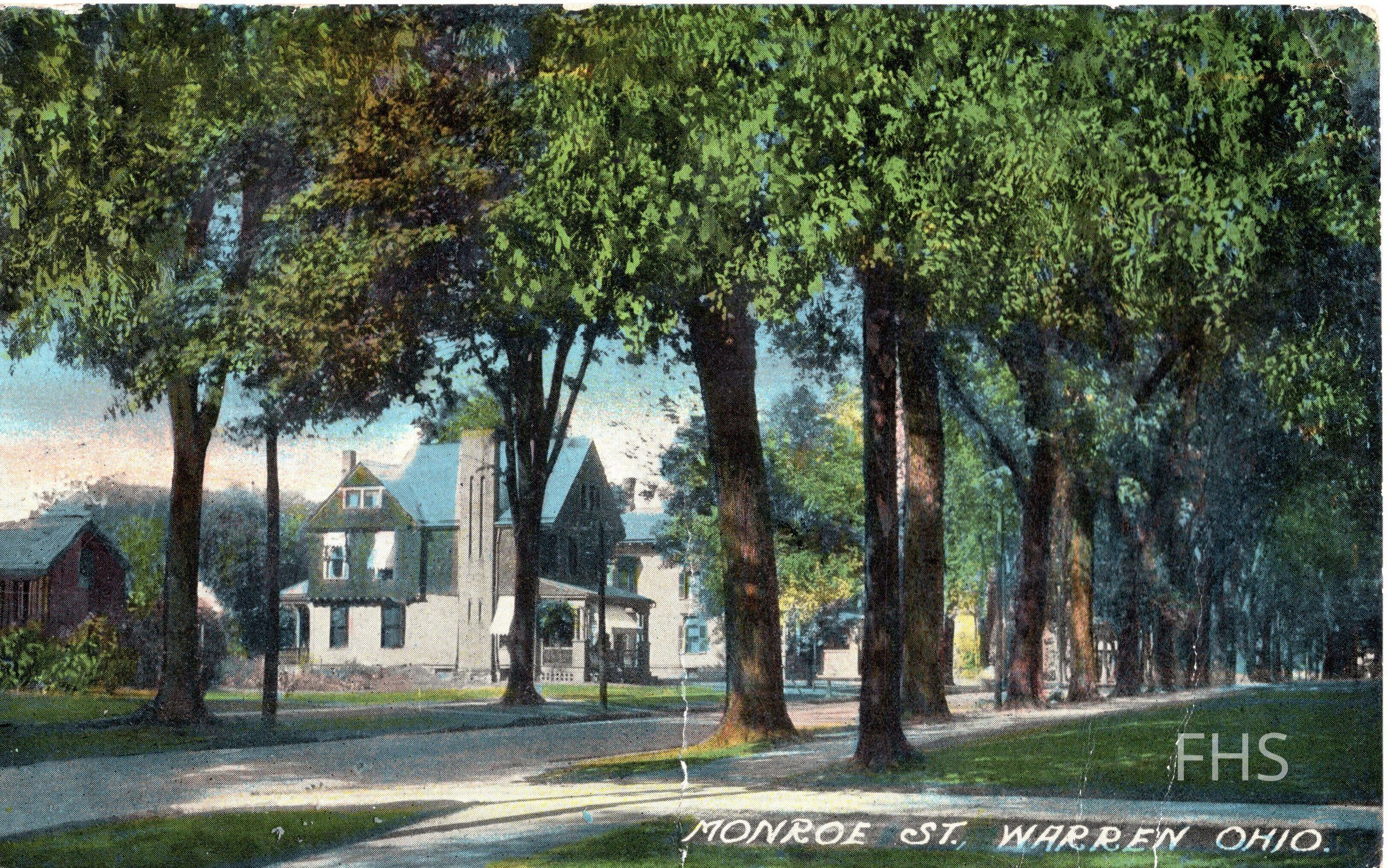 A postcard featuring Monroe Street in Warren, Ohio sent to Thad Barker by Nina in 1910.Cataloged By