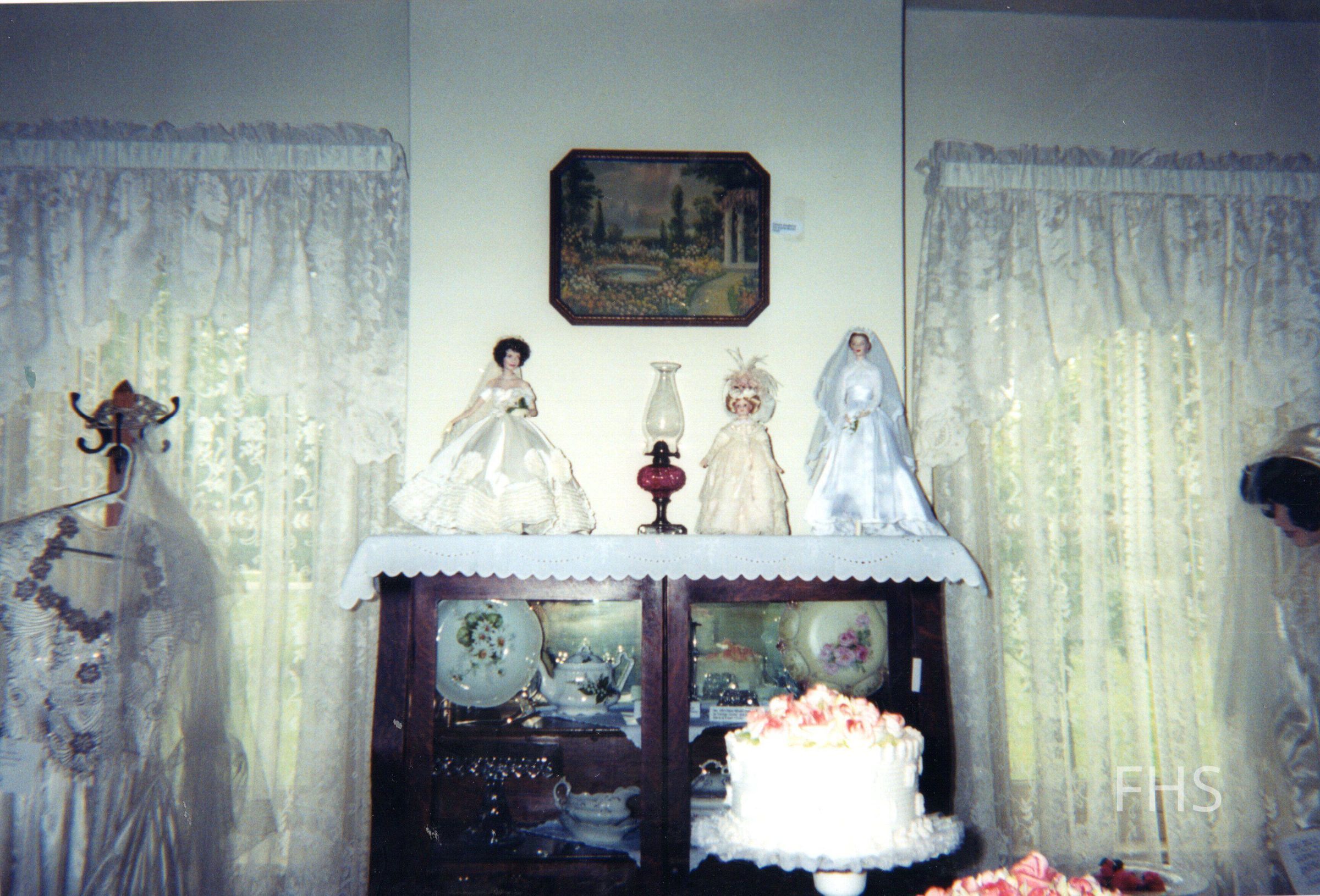 A photograph of a temporary display of wedding dress, dolls in wedding dresses and wedding cake at the Butts Museum by the Fowler Historical Society.Cataloged By
