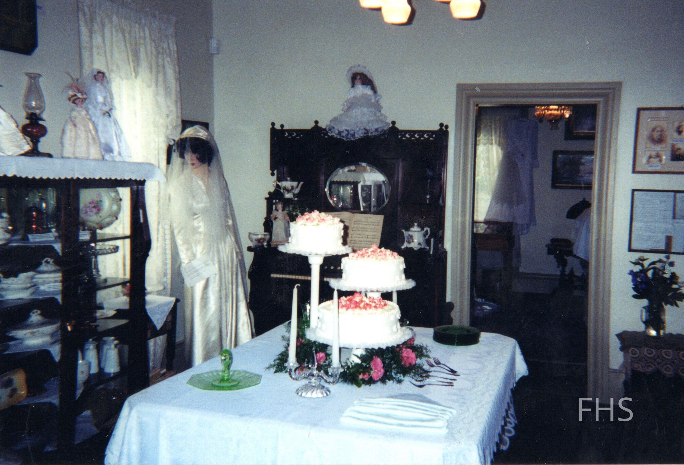 A photograph of a temporary display of a wedding dress and wedding cake at the Butts Museum by the Fowler Historical Society.Cataloged By