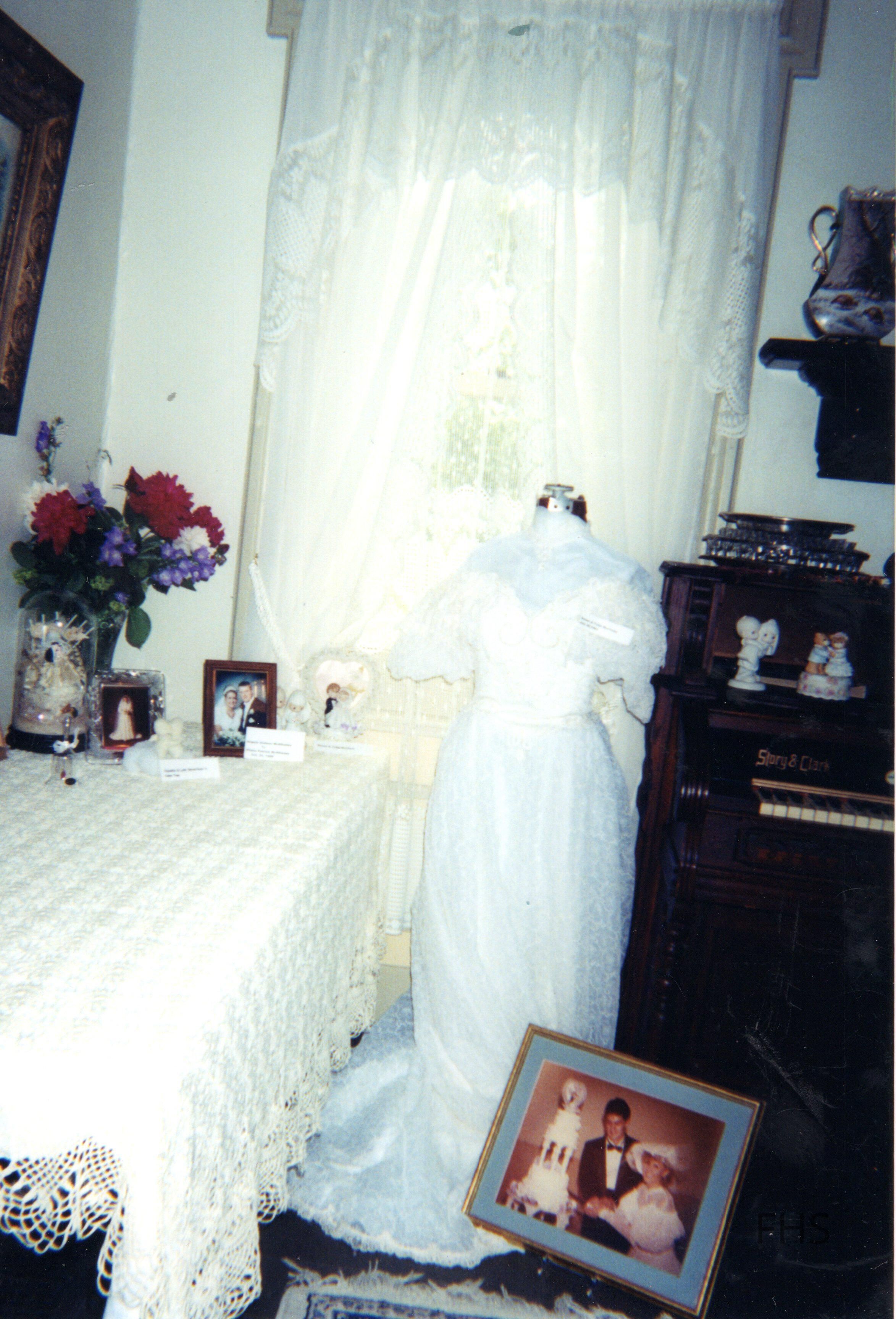A photograph of a temporary display of a wedding dress at the Butts Museum by the Fowler Historical Society.Cataloged By