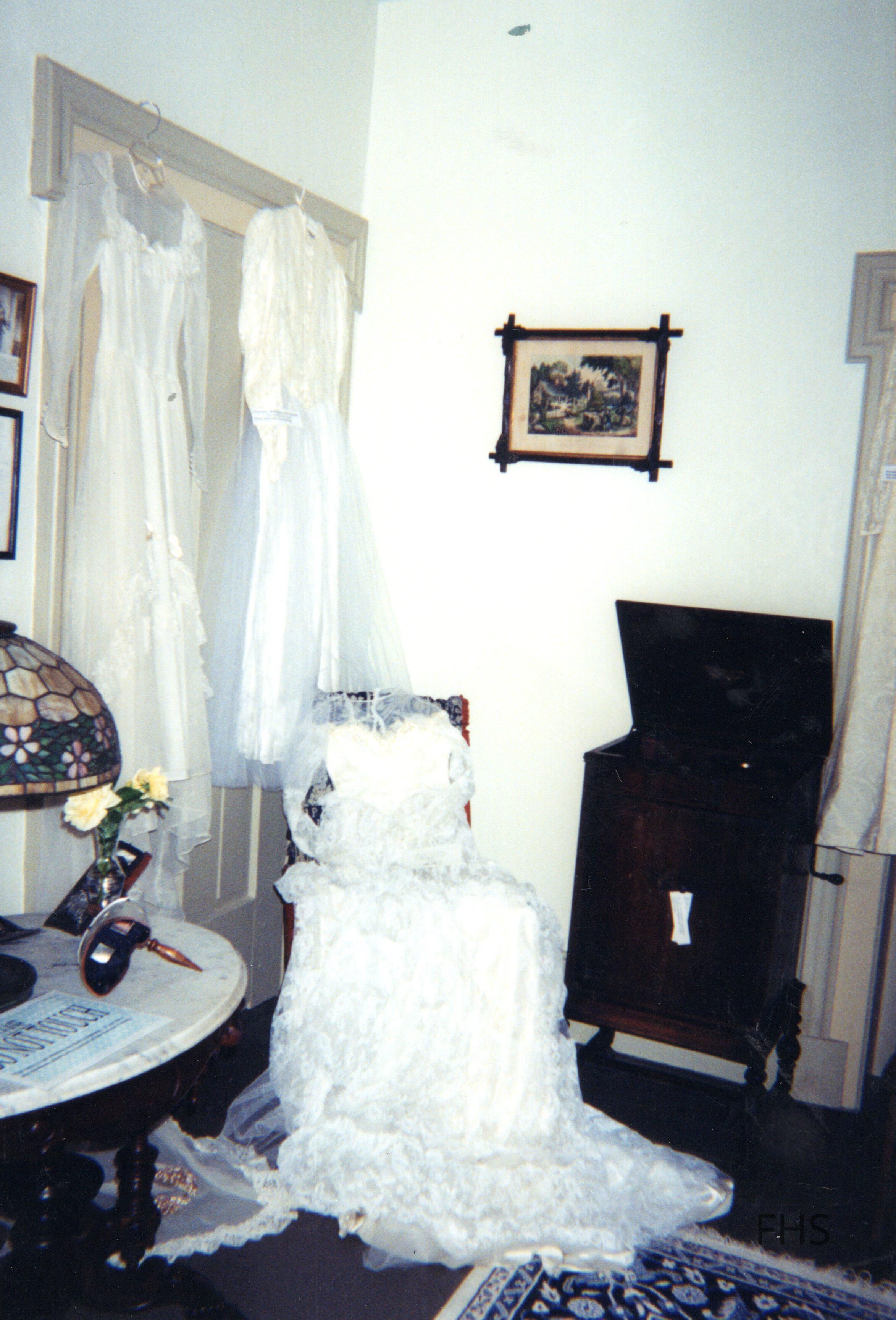 A photograph of a temporary display of wedding dresses at the Butts Museum by the Fowler Historical Society.Cataloged By