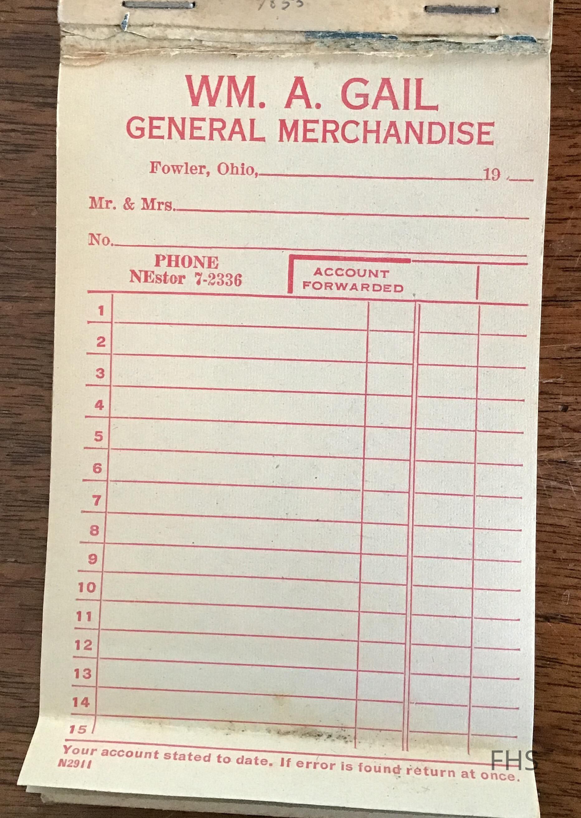 A receipt book from Wm. A. Gail General Merchandise in Fowler Ohio. This business was located in Fowler Center and now called the General Store.Cataloged By