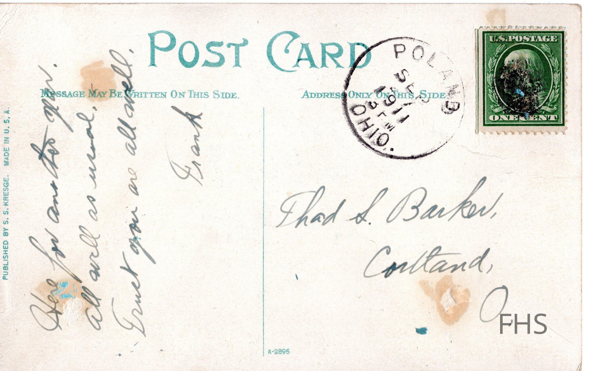A Youngstown City Hospital postcard sent to Thad Barker from Frank in 1911.Cataloged By