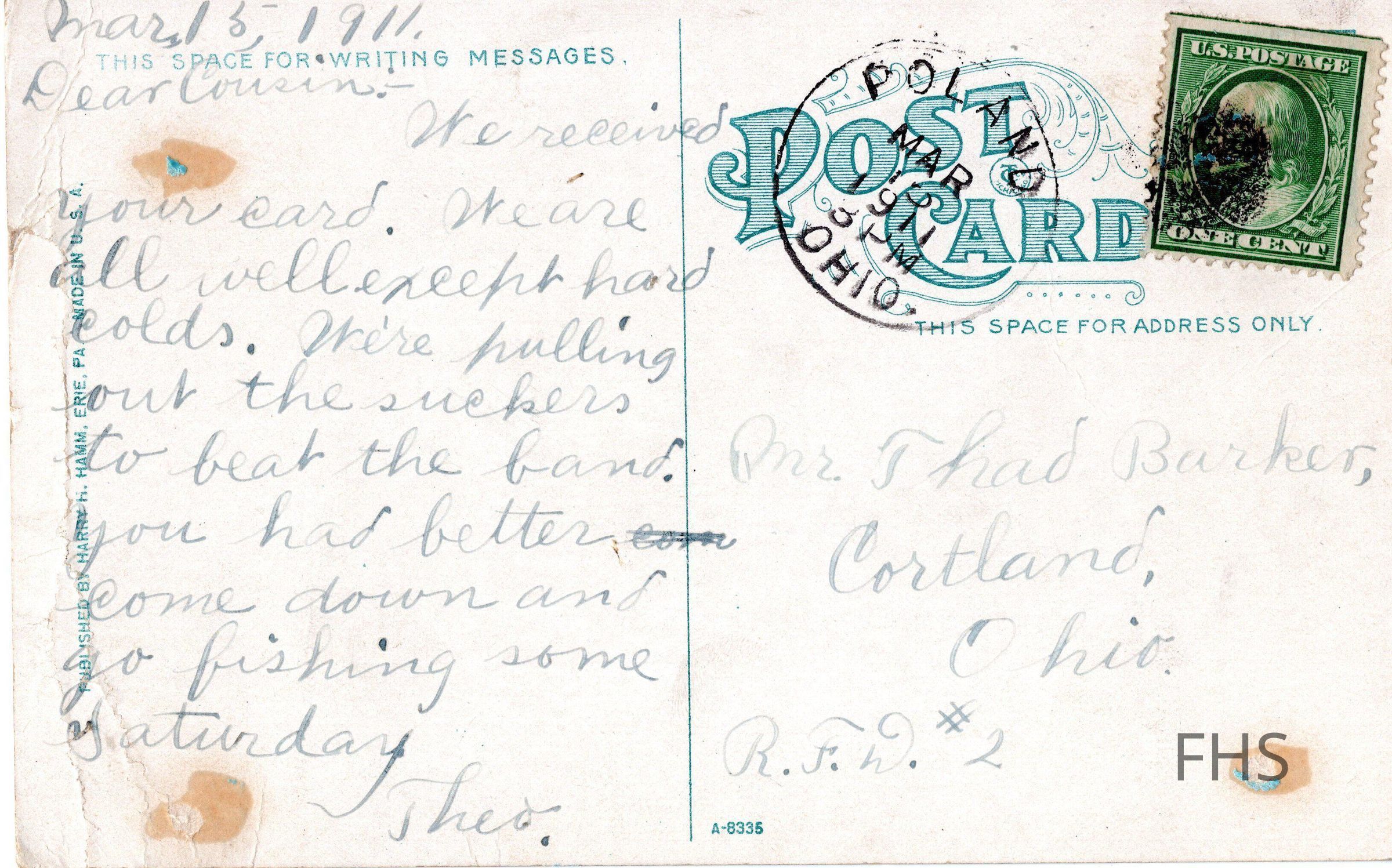 A postcard featuring Masonic Temple in Youngstown, Ohio sent to Thad Barker by Theo in 1910.Cataloged By