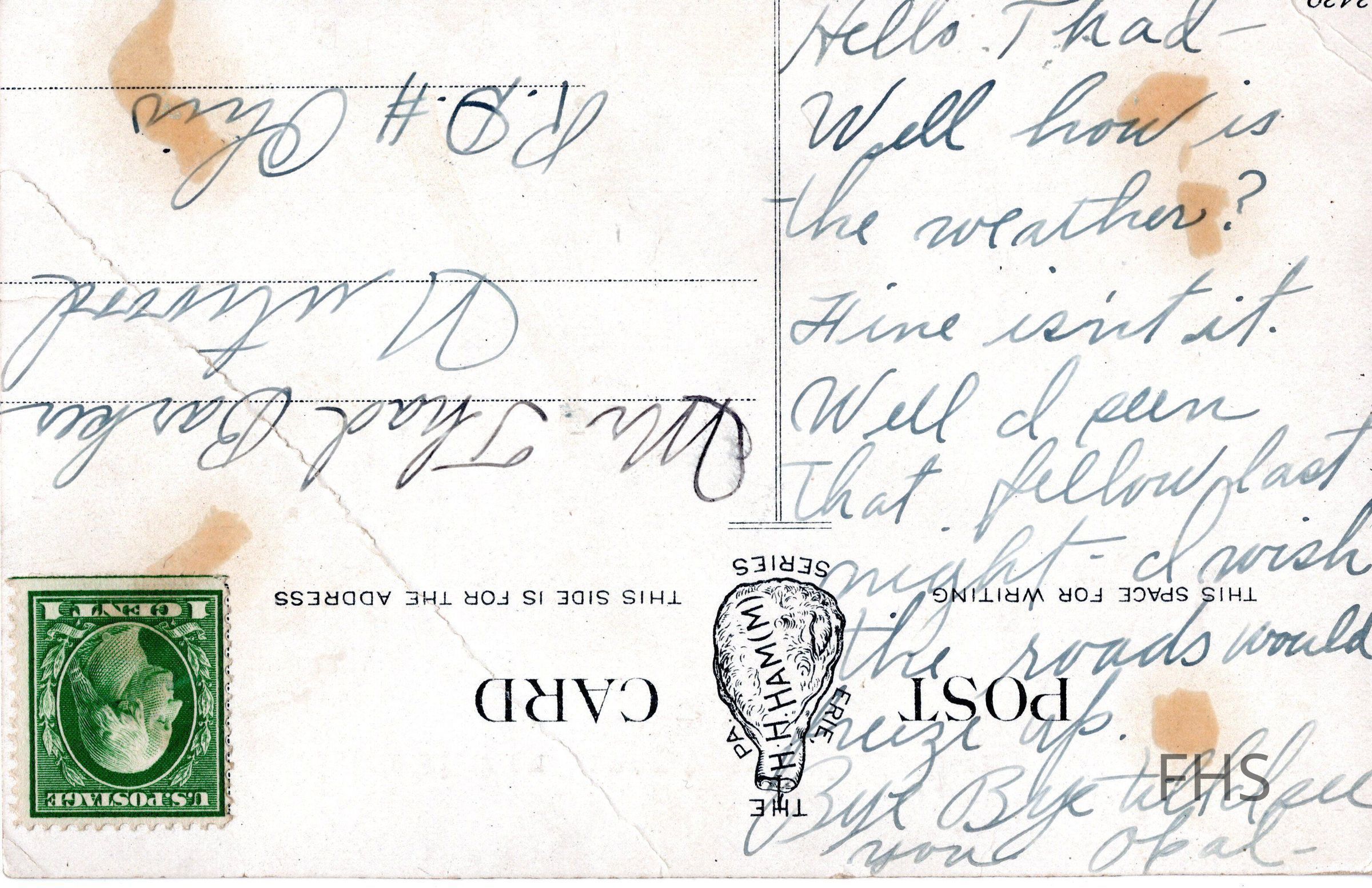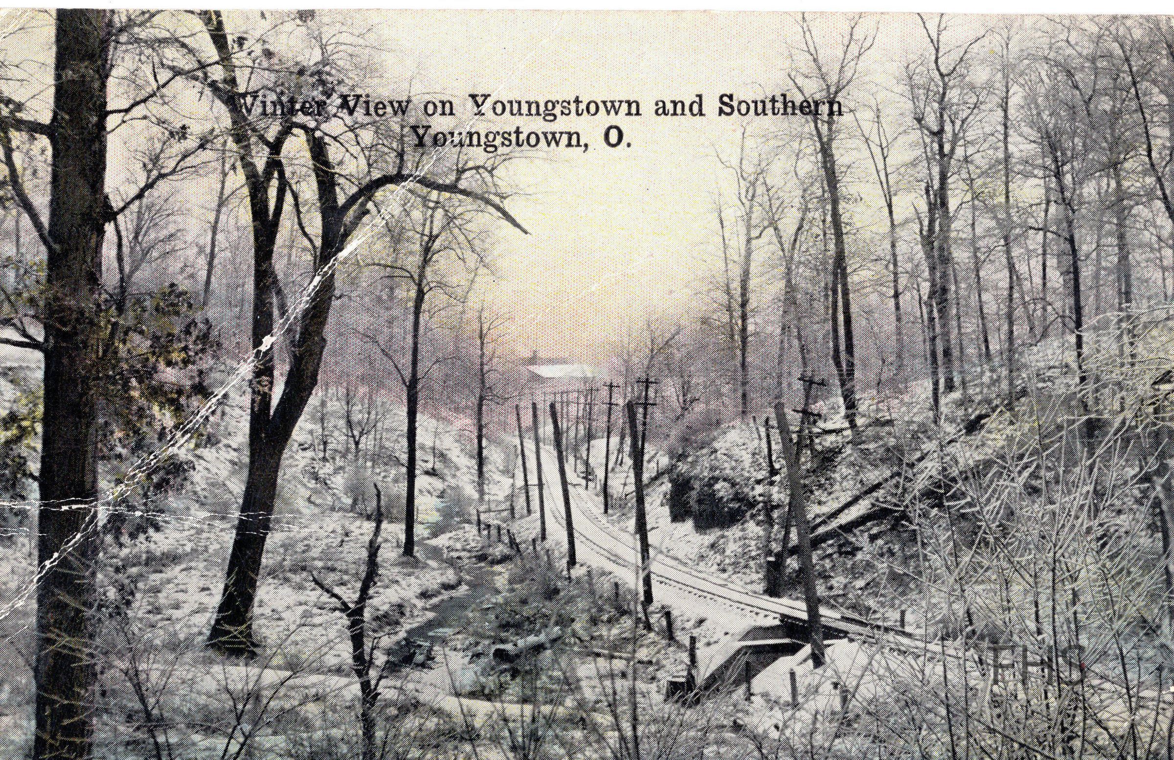 A postcard sent to Thad Barker with a winter view of Youngstown and Southern in Youngstown, Ohio. It was signed Opal.Cataloged By