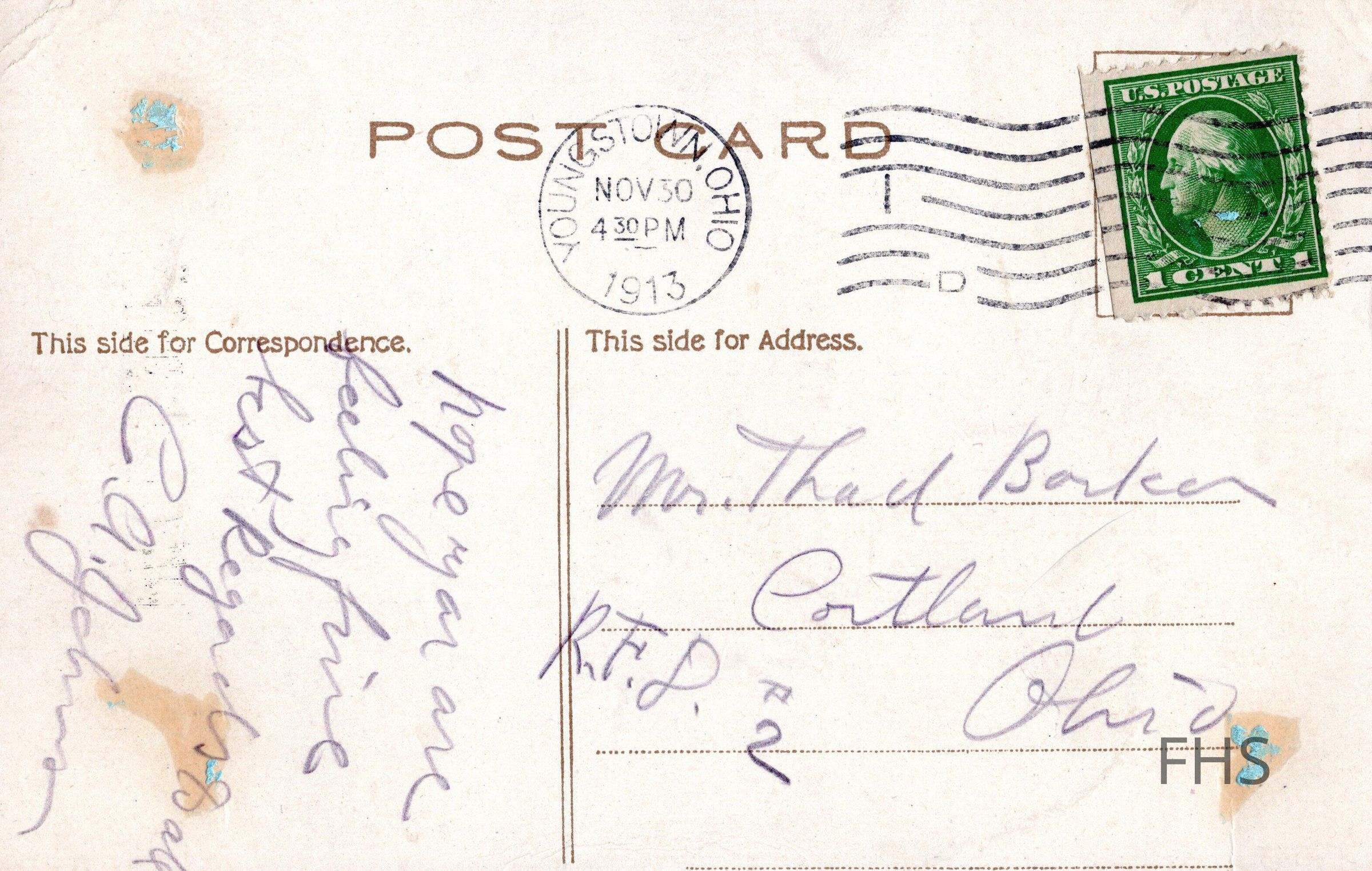 A Youngstown, Ohio postcard sent to Thad Barker from C. A. Johnson in 1913.Cataloged By