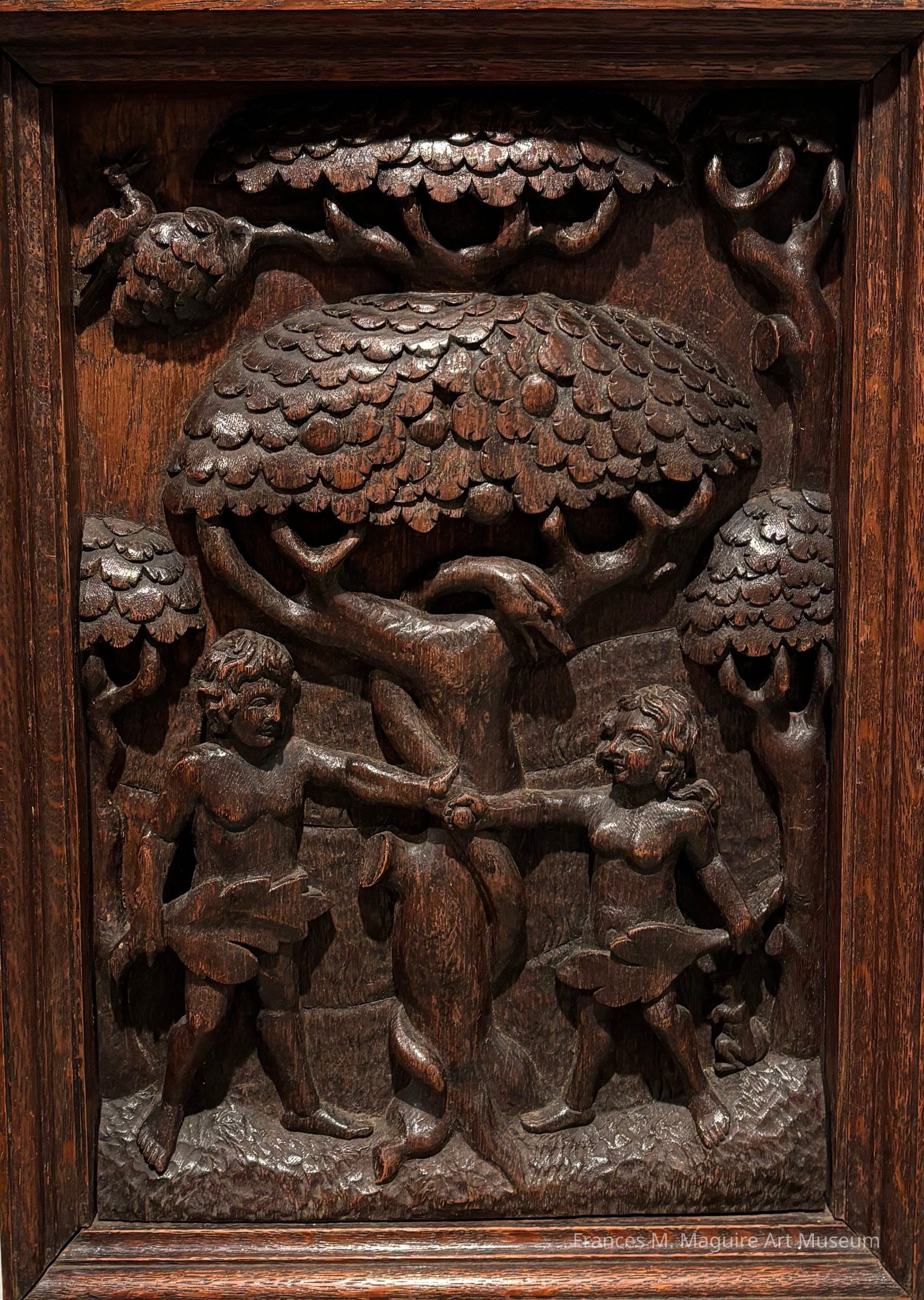 German carved wood panel depicting Adam and Eve in the Garden of Eden.