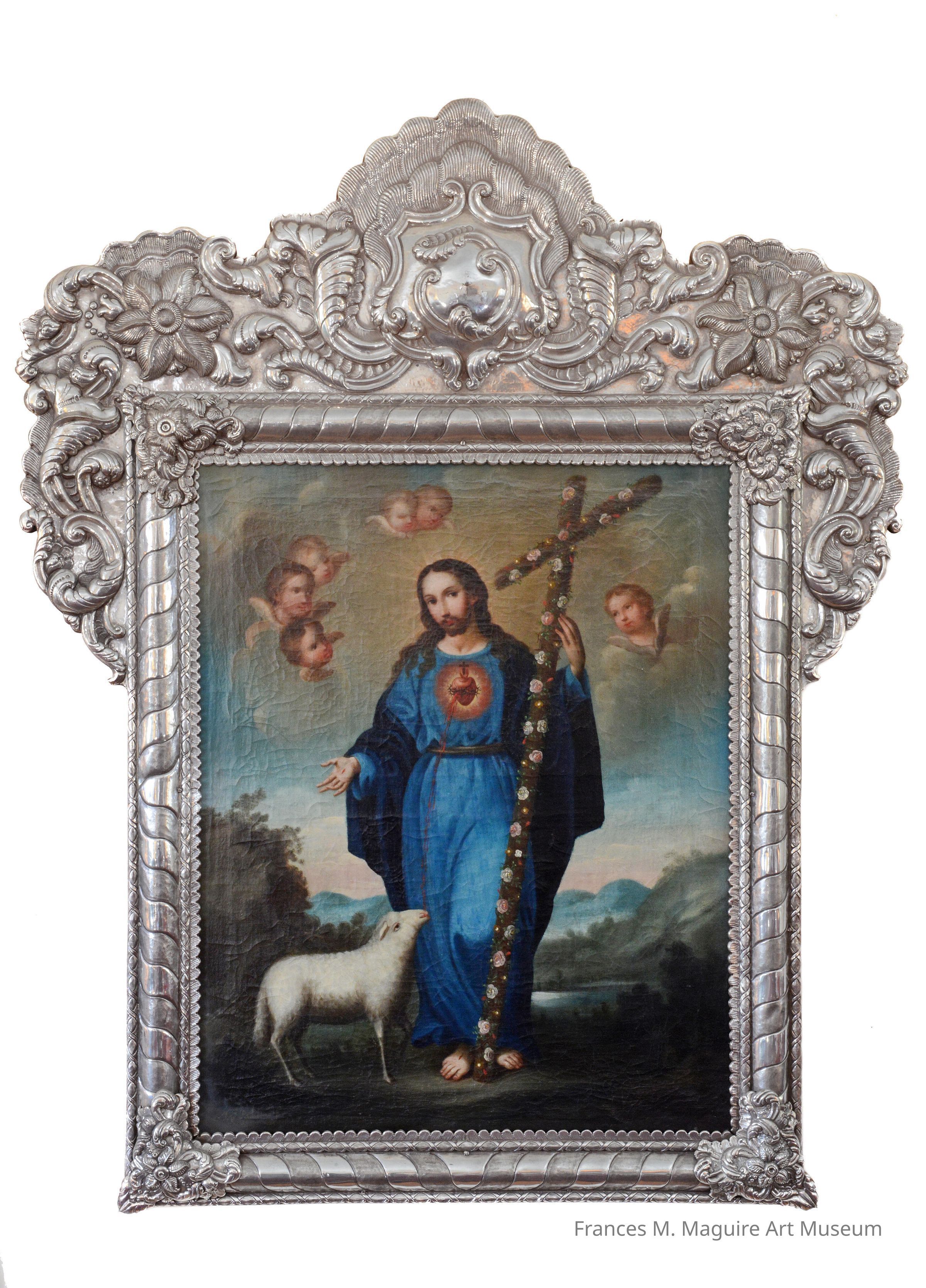 This painting blends two Christian subjects, the Sacred Heart and Jesus as Good Shepherd, a combination popular in Spanish America. Dressed in flowing blue robes, Jesus walks in a green pasture holding the flowering cross, a motif dating to the Medieval period. Blood flows from Jesus’s exposed heart into the mouths of the sheep at his side, symbolic of his role as redeemer of humankind. The focus on the sacred heart of Christ dates to the 17th c. when the Jesuits established its cult. Images like this one resonated with Mesoamerican/Indigenous beliefs about the sacredness of the heart.
