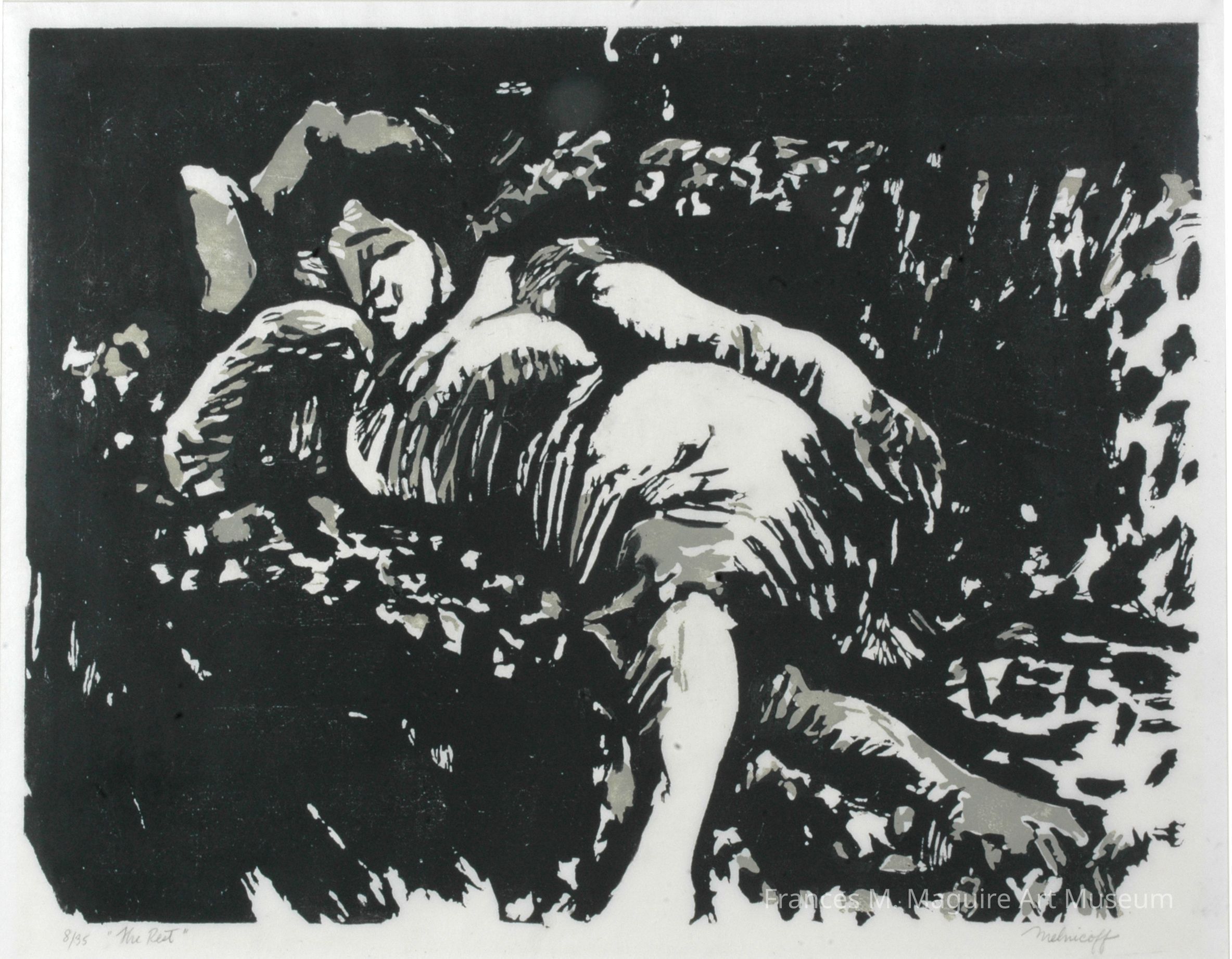 20th-c. black-and-white woodcut print of a woman resting. Ed. 8/35.Made/Created