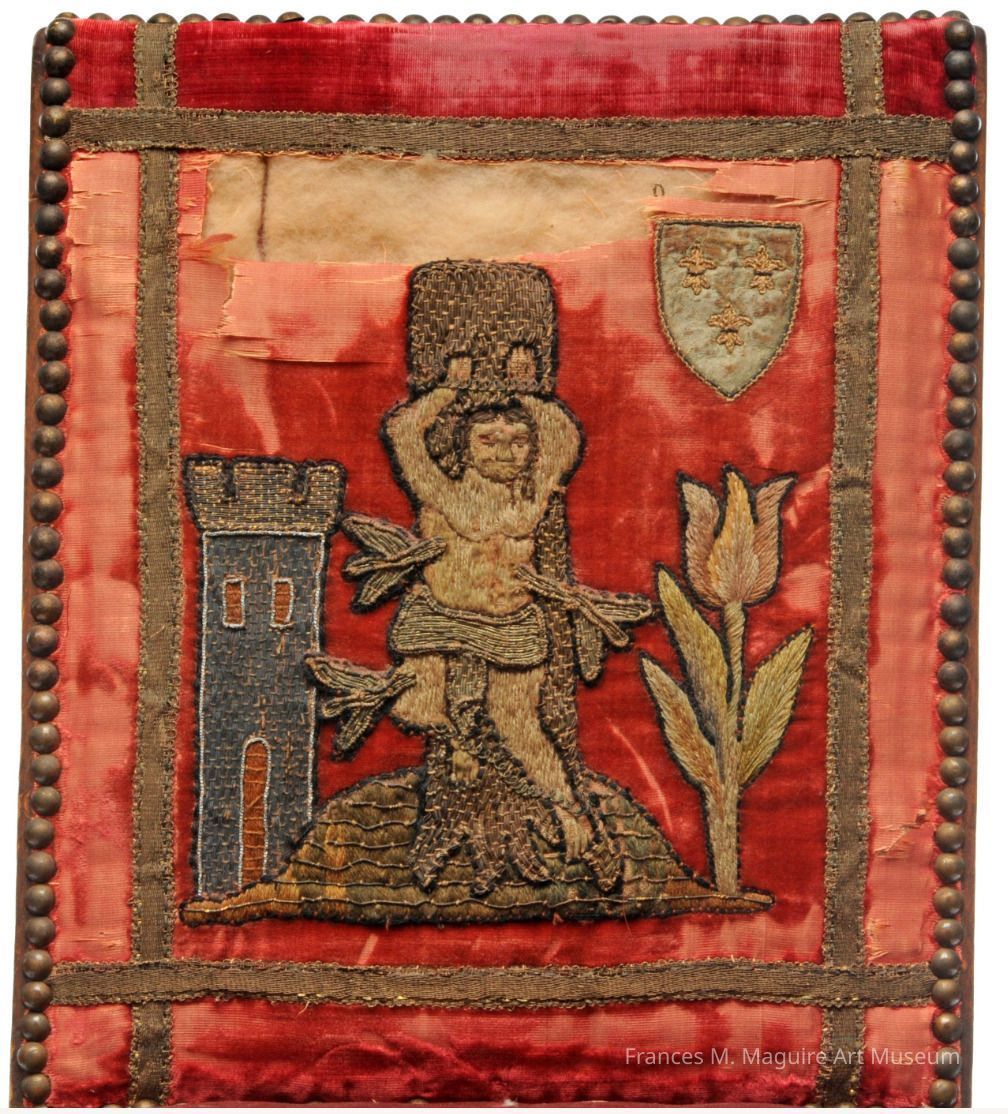 18th-c. children's backstool with an embroidered textile back depicting St. Sebastian. St. Sebastian is tied to a pillar, and there are emblems of a tower, a large tulip, and a shield. This backstool is one of two English or Belgian chairs. The embroidered figures and decorations on the backs are earlier, perhaps 17th century and have been re-applied in more than one re-covering effort.Dimensions
