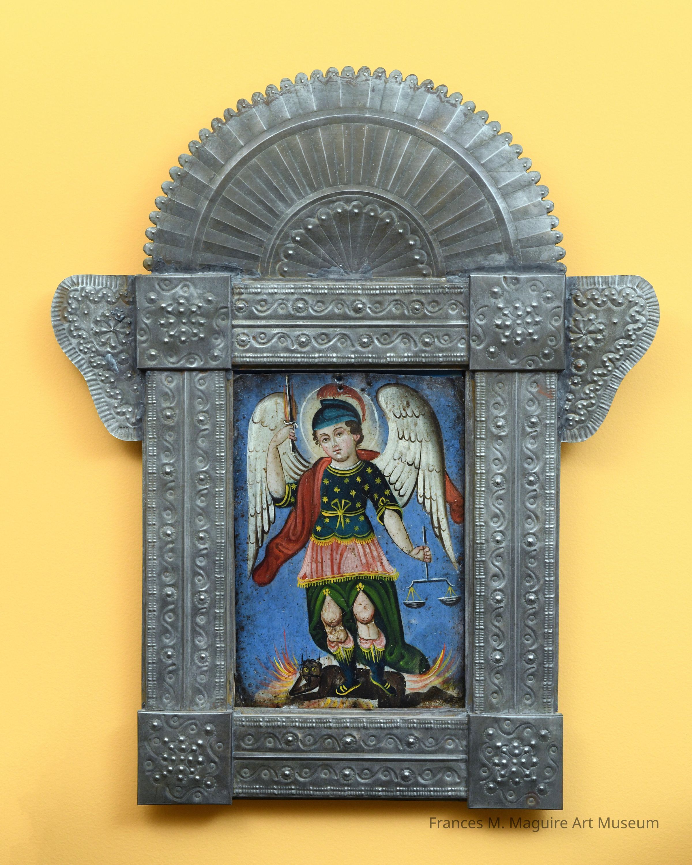 19th c. Mexican retablo of St. Michael the Archangel in decorative pressed tin frameMade/Created