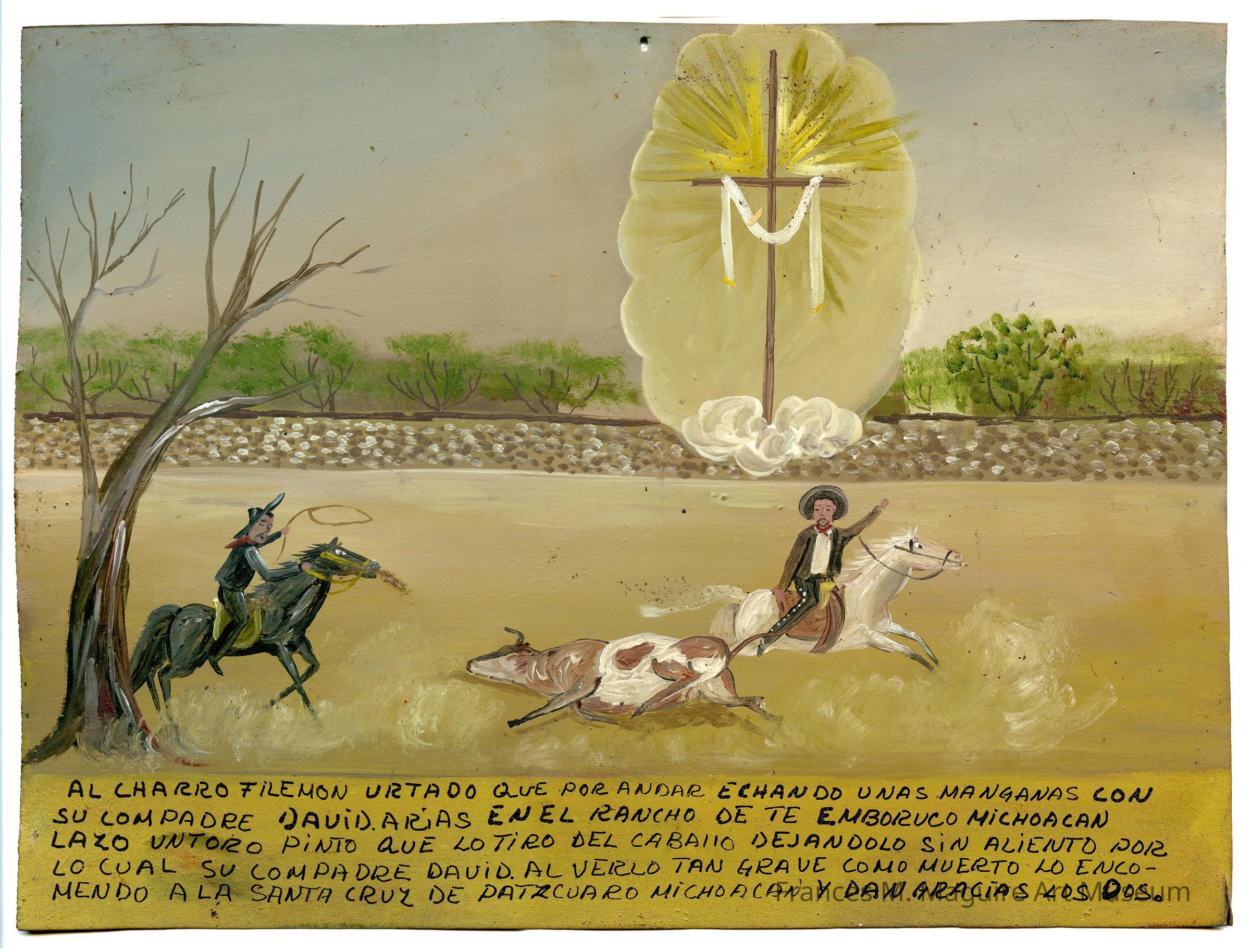 20th c. Mexican Ex Voto about Filemon Urtado and his Fall from a Pinto Bull - Mexico. Translation: “Filemon Urtado, the cowhand, while lassoing a bull with his compadre, David Arias, in the Ranch Te Emboruco Michoacan, he lassoed a Pinto bull which knocked him off his horse and his compadre when he saw him near death he commended his life to the Santa Cruz de Patzcuaro, and they both gave thanks.”Made/Created