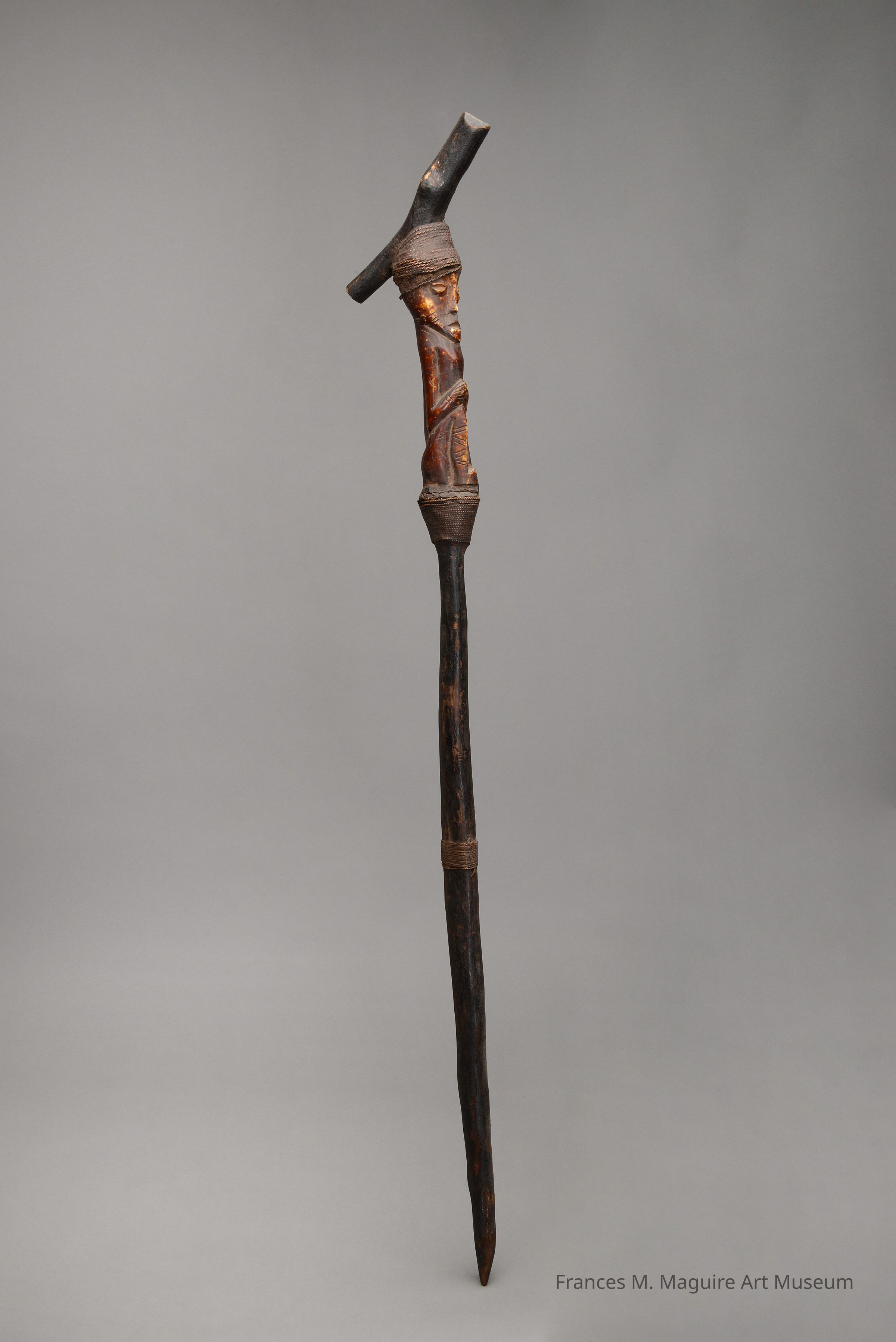 20th c. African wooden walking stick decorated with a male figure carved from bone and attached to the stick with braided copper wire securing the top and bottom of the figure.