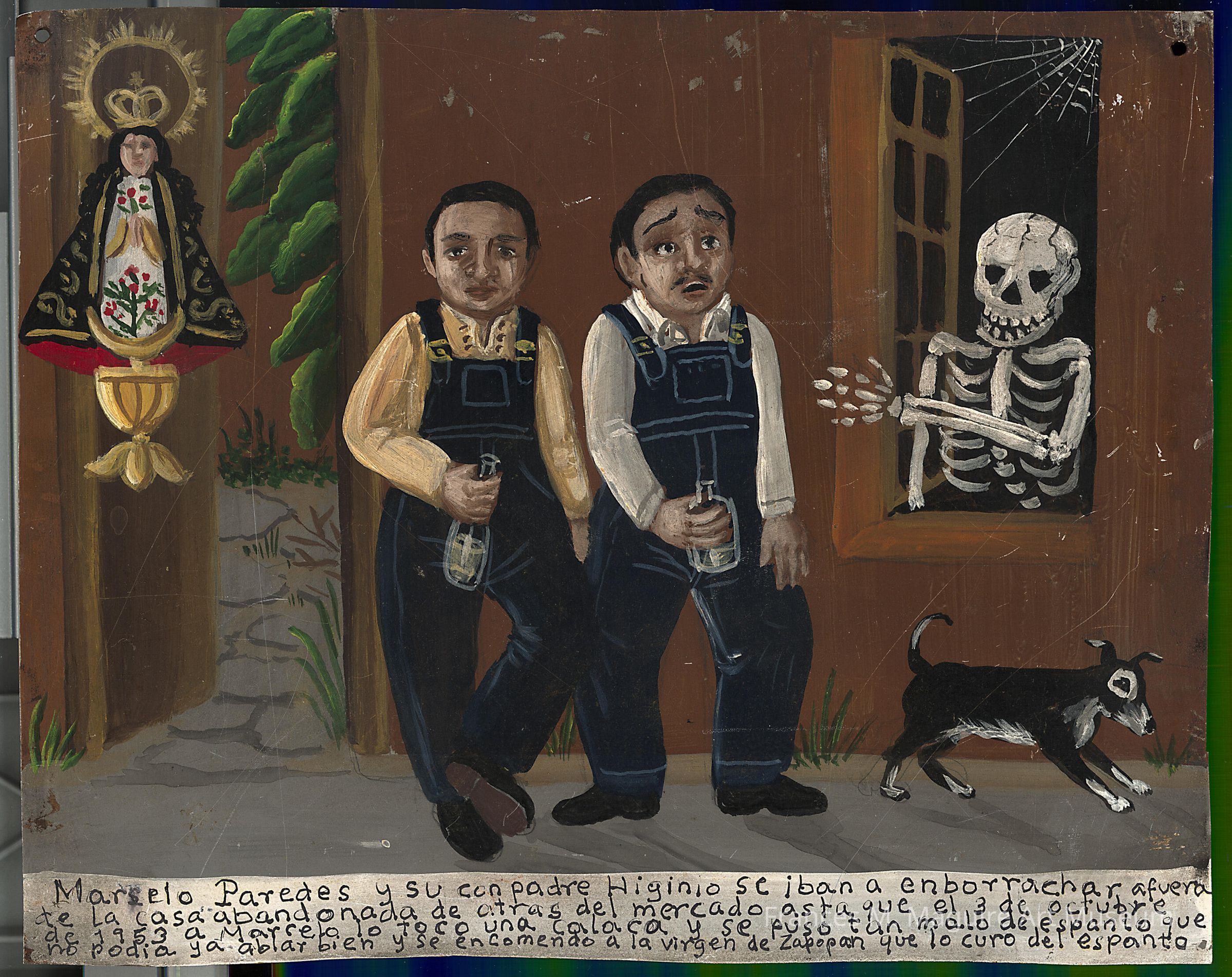 20th-century ex voto. Inscription: “Marcelo Paredes and his father Higinio left to get drunk outside the abandoned house behind the store until the 3rd of October 1953 a skeleton touched Marcelo and put a hex that stopped him from speaking well, and he prayed to the Virgin de Zapopan who cured the hex.”Made/Created