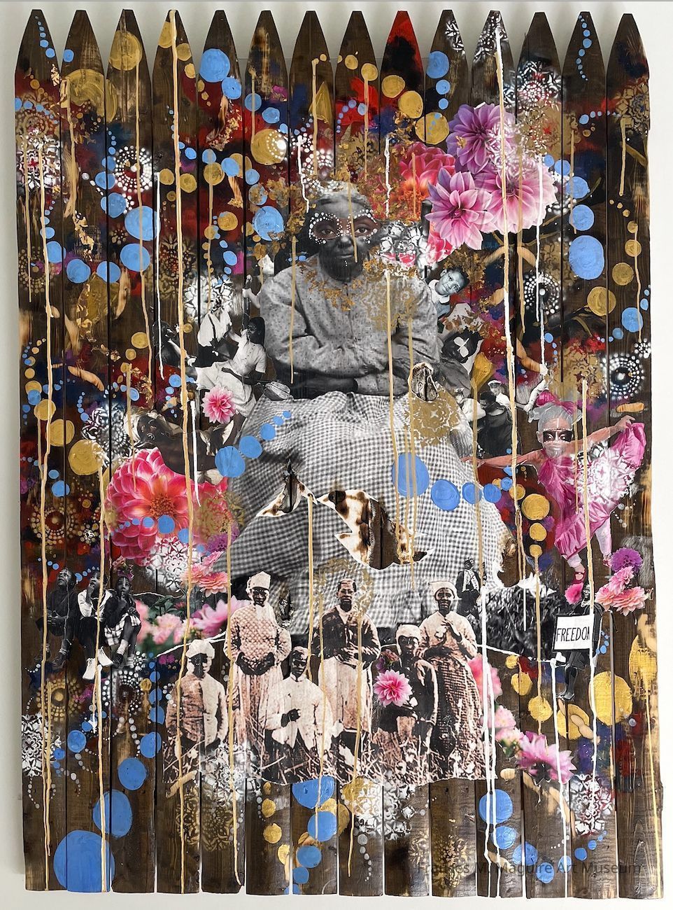 Still Here probes the notion of freedom for African American women. The central figure is a formerly enslaved woman named Aunt Polly Jackson, whose story the Federal Writers’ Project documented in the 20th c. Despite her fiery spirit and bravery (she helped others escape slavery), following the Civil War she remained with her enslavers. Surrounding Aunt Polly are cut-out photos and images of other enslaved men and women, freedom fighters, and children—including Sarah Collins, the only survivor of the 1963 Birmingham bombing. Through juxtaposition and layering, Ballard highlights the complexity of Aunt Polly’s and other African American women’s stories of freedom. The figures convey struggle and uncertainty, and at the same time strength and hope.
