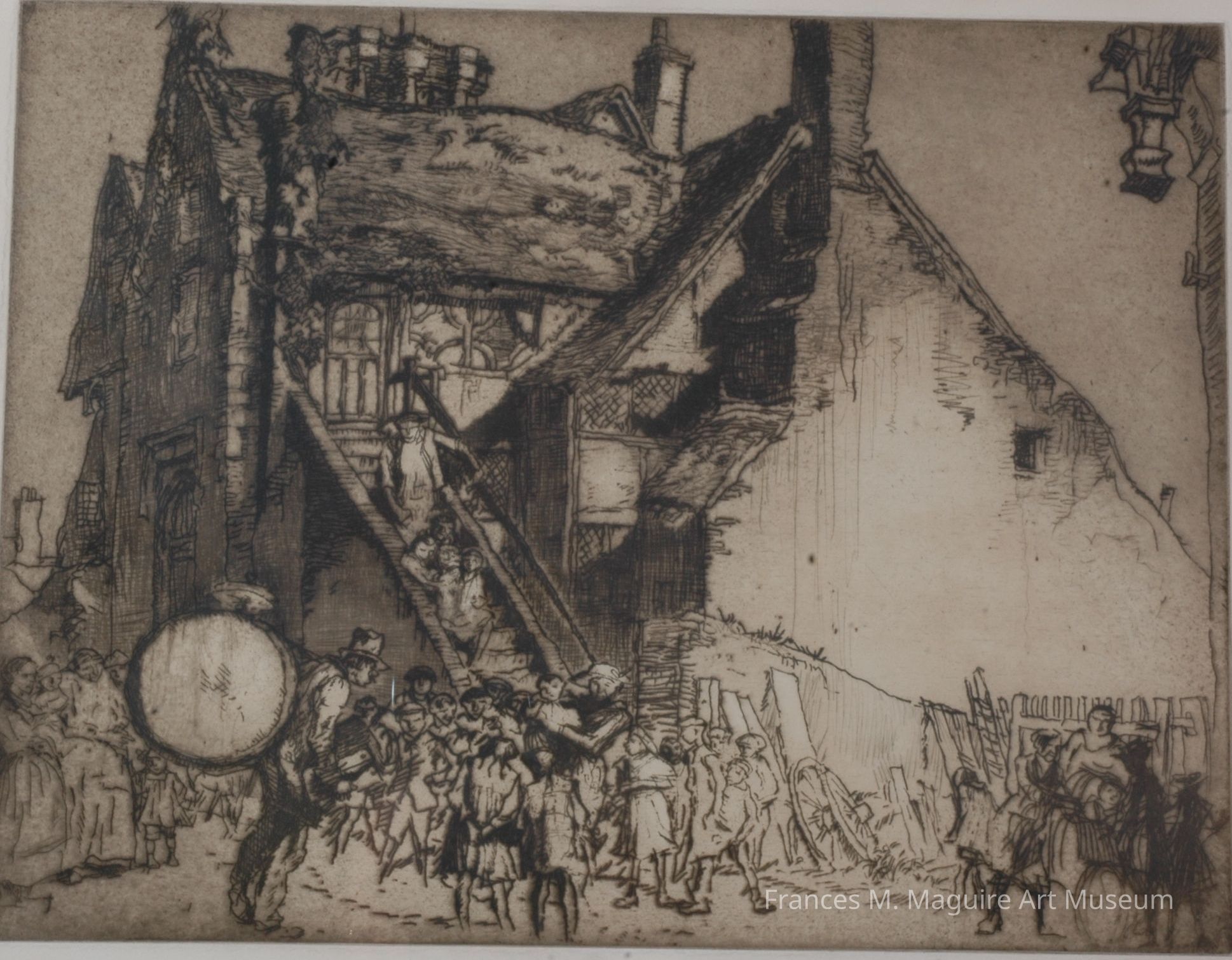 20th-c. black-and-white intaglio print of a street scene in Ditchling, England