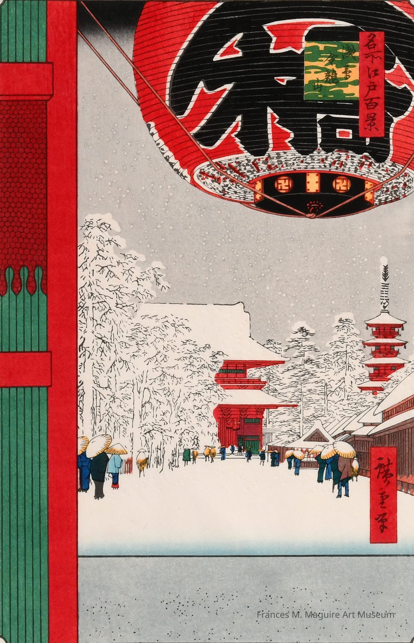 The distinctive red buildings of the Buddhist temple Kinryūsan Sensōji, still a popular site in the district of Asakusa, contrast with the winter sky thick with snowy clouds. Hiroshige invites viewers into a serene yet busy temple ground, where townsfolk gather for worship, commerce, and social exchange. The towering gate, adorned with a large lantern, frames the sacred precinct, guiding the eye toward the temple’s inner courtyard. The bottom section of the overhanging lantern is decorated with the swastika, an ancient symbol representing good luck and well-being, and used in Buddhism as a mark of divinity. Hiroshige highlights both the architectural beauty of the temple and the lively spirit of Edo.Label Type