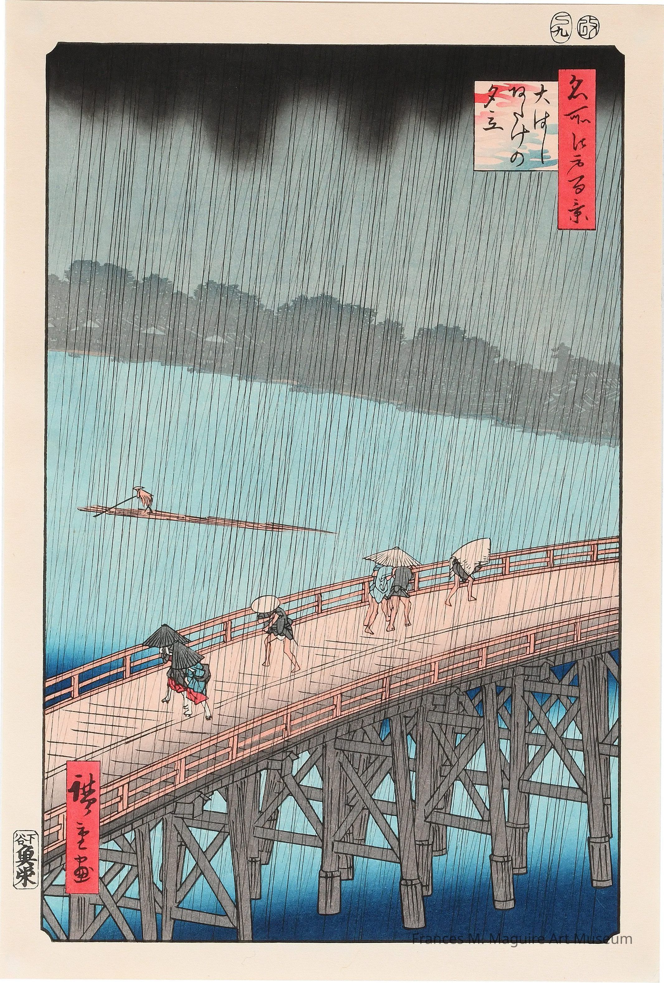 In this series, Hiroshige focused on scenes in the city of Edo itself. Here, figures scurry across the Shin-Ōhashi (New Great) Bridge in a driving rain. The print is a technical tour de force, with its delicate black rainfall and the brilliant blue water of the Sumida River beneath the bridge. Notice also the bold and clear yet subtle gradation of the water and the faint shoreline of Atake in the distance. Hiroshige leads the eye into the composition with a series of intersecting diagonals formed by the span of the bridge, the boat in the water, and the misty trees of the opposite shore.Label Type