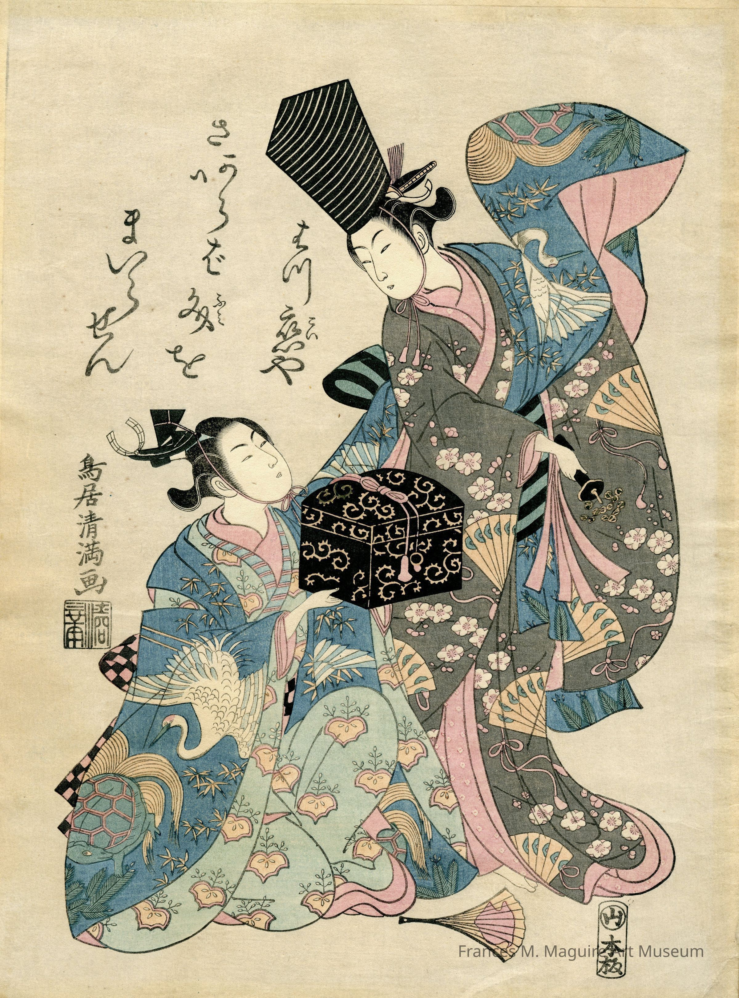 The Sanbasō is a ritualistic dance usually performed before kabuki plays to encourage prosperity and longevity. Two separate sections of the dance are portrayed here as if they occur simultaneously. First, an actor removes their mask and places it in a box like the one depicted in the center of the print. Later in the performance, another actor dances with a stick of bells representing grains of rice, seen here in the hand of the figure on the right. By displaying two distinct parts of the dance together, Kiyomitsu trades an accurate scene for a fuller representation of the Sanbasō as a whole.Label Type